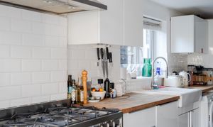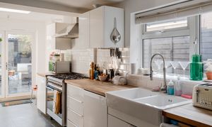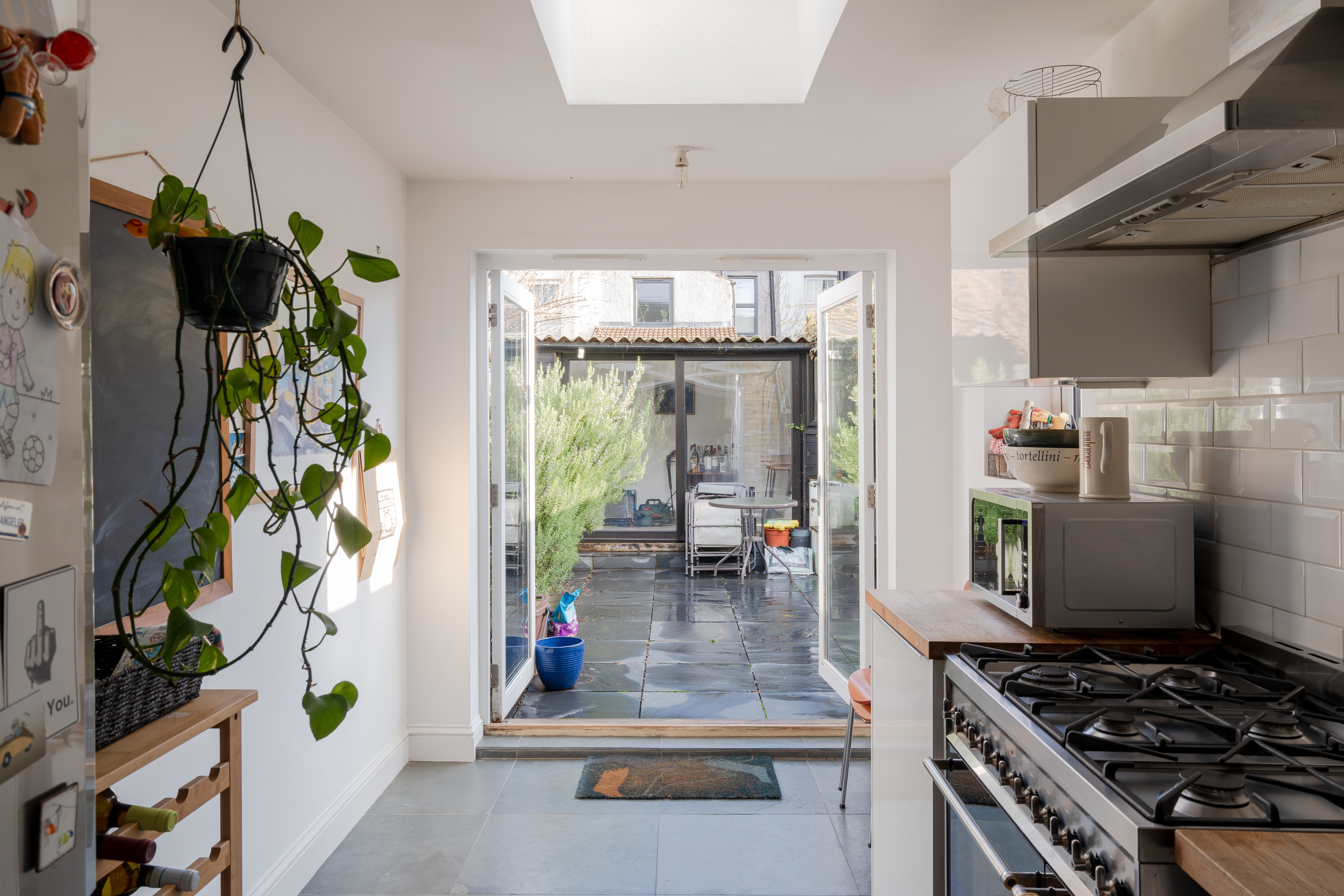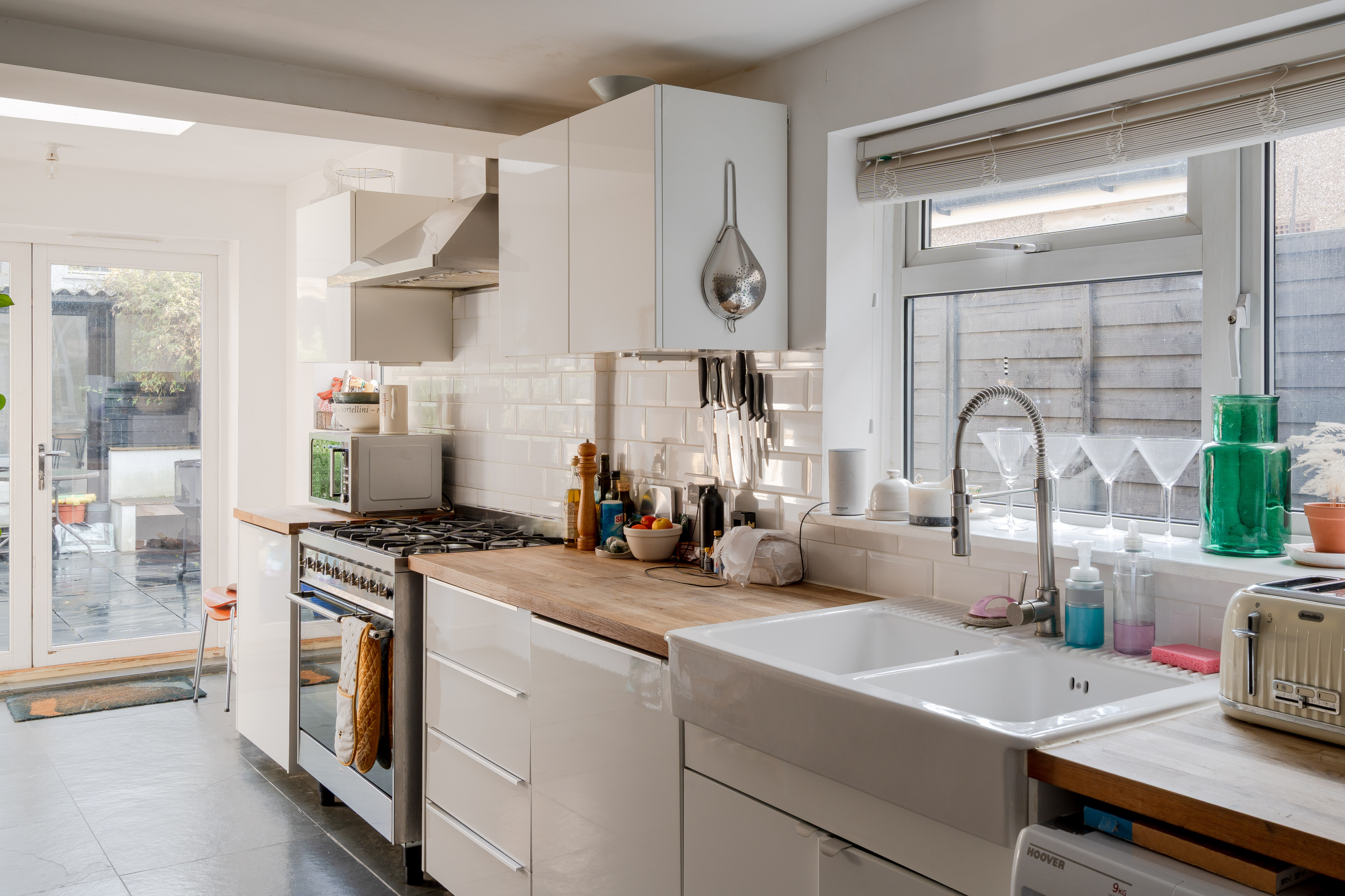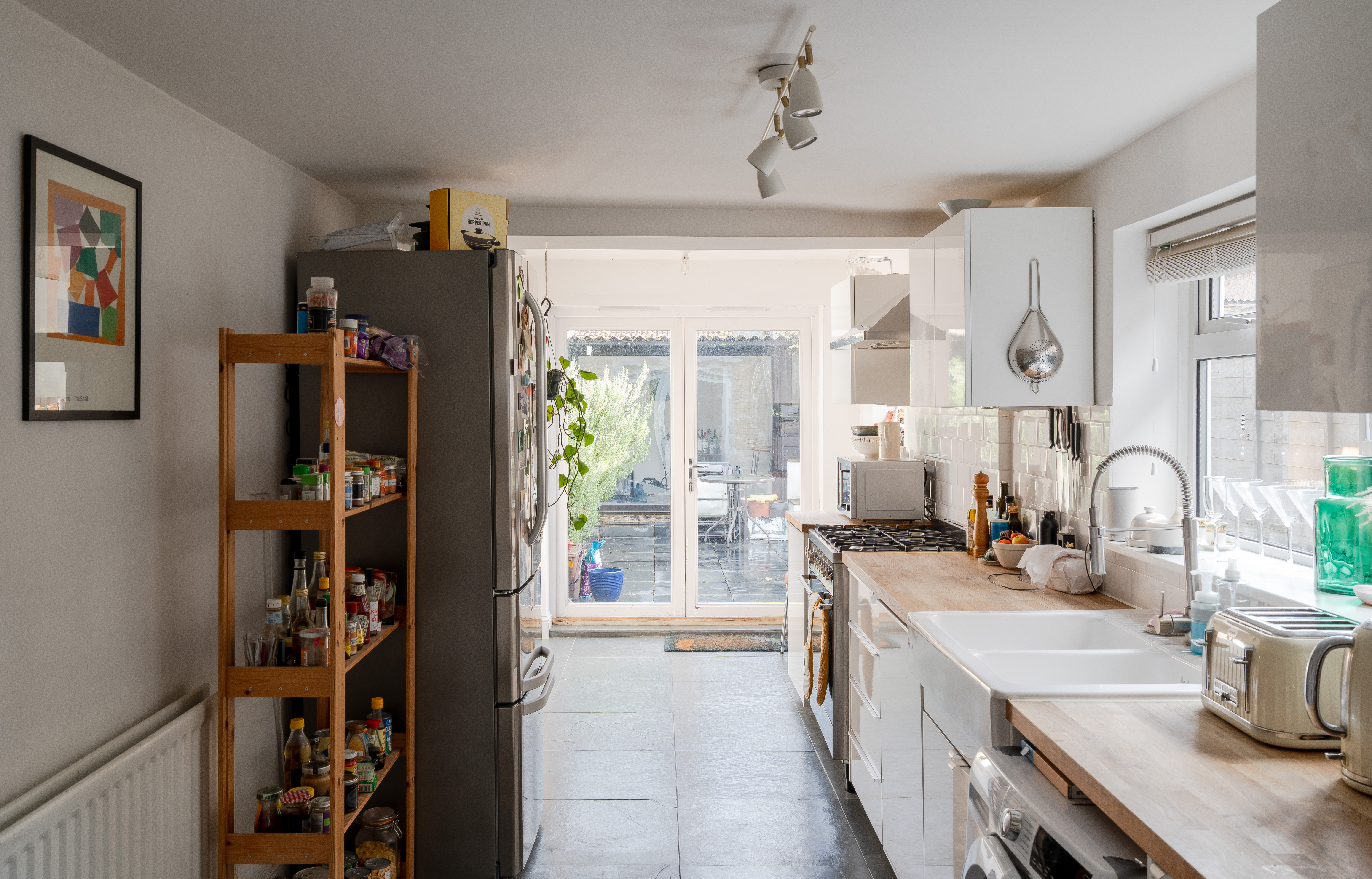 Continue through to discover the extended kitchen at the rear, a bright and practical space lit by contemporary linear spotlights. Glossy white cabinetry pairs with warm wooden worktops and a white metro-tiled splashback, whilst dark format floor tiles ground the scheme with a modern edge. A double butler-style sink sits beneath a side window dressed with a Venetian blind, and French doors open directly onto the garden, flooding the space with natural light and creating an easy connection to the outdoors.
