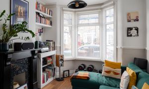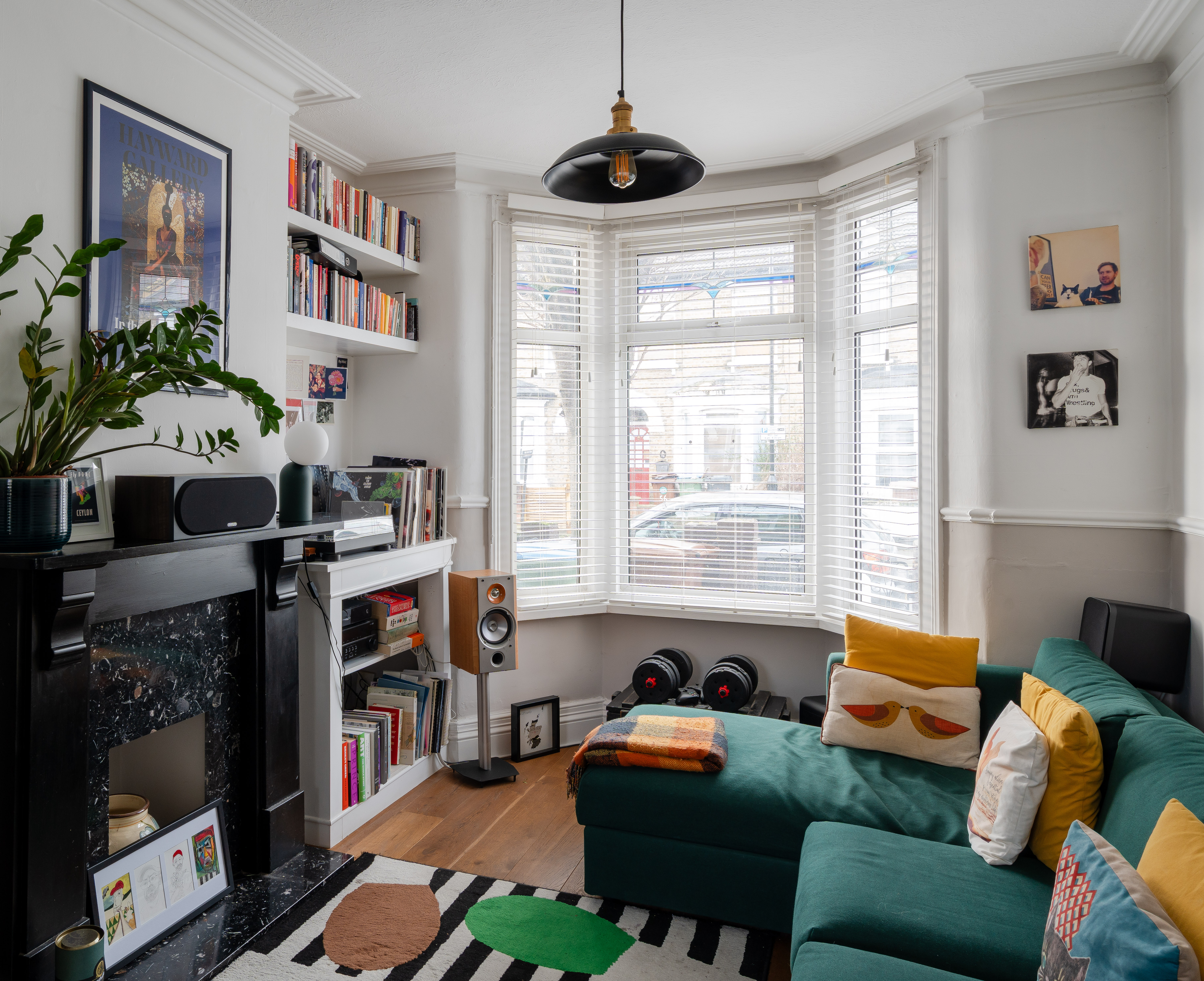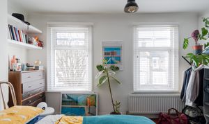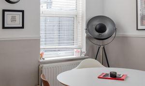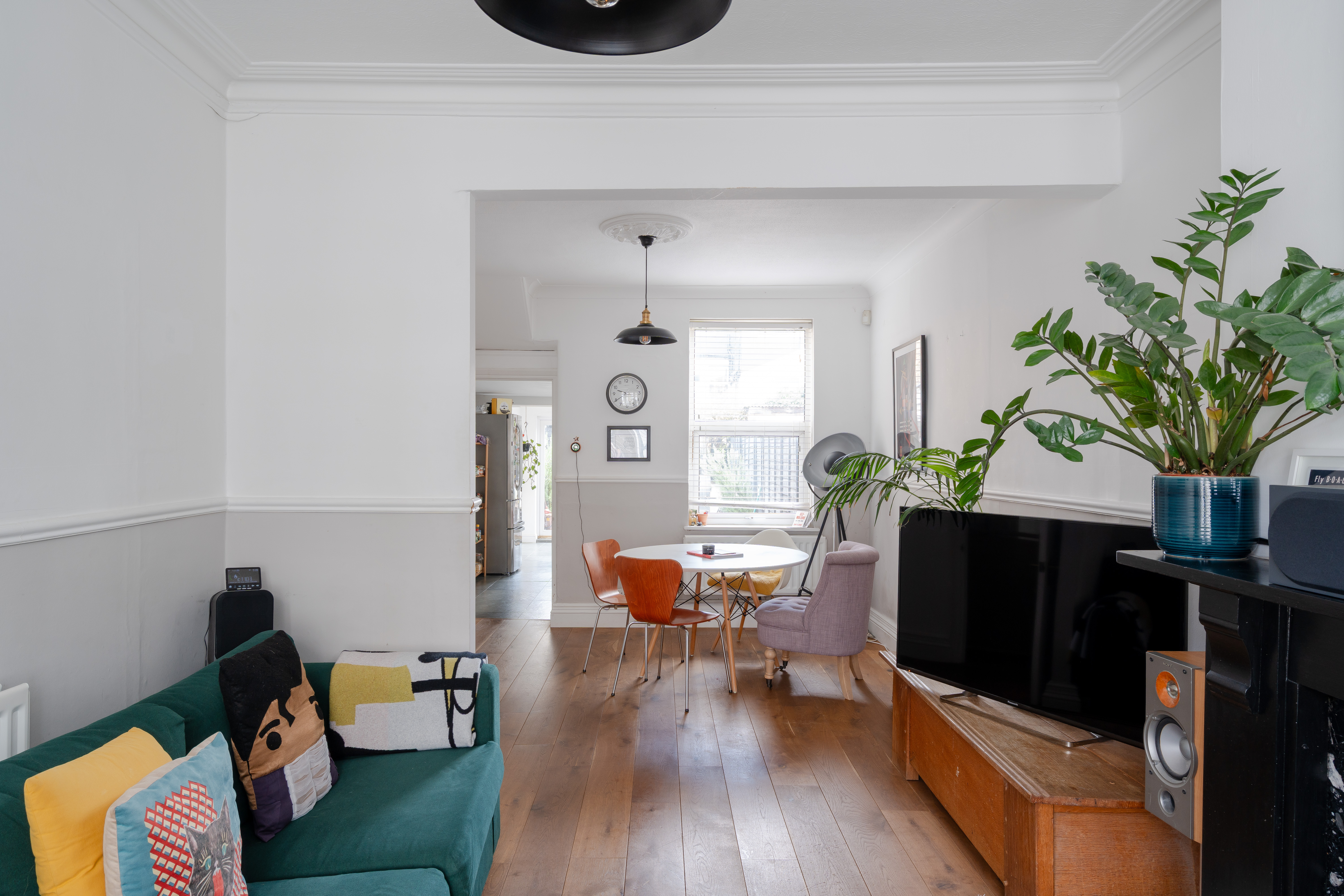 The relaxed décor and wooden floorboards extend into the dining area, where a tall window with a fitted Venetian blind overlooks the garden, and a ceiling rose and pendant light – with a coordinating shade to match the living room – brightens a space for a table below.