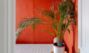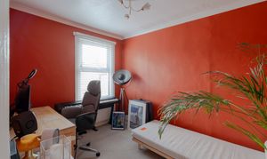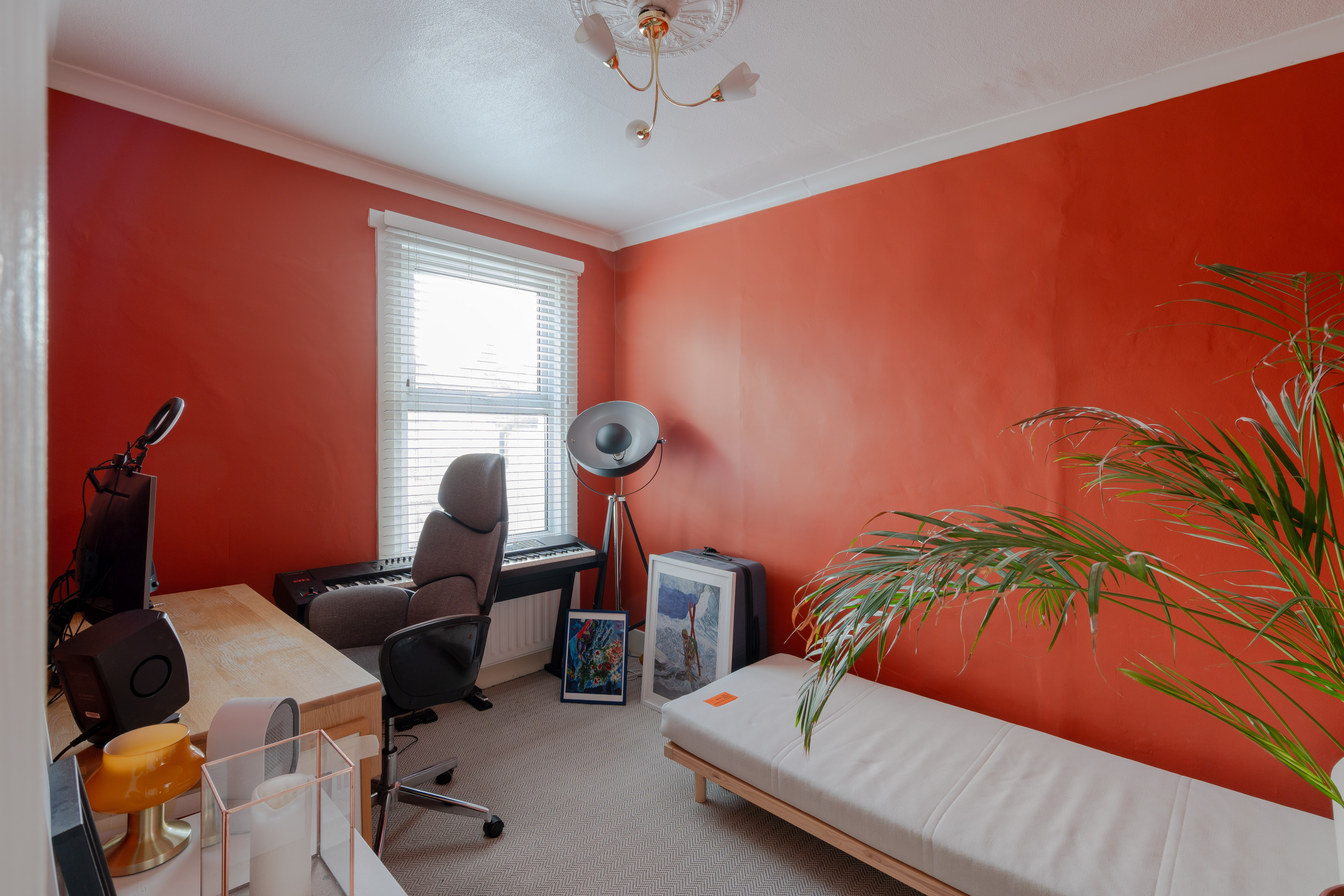 The second bedroom is a good-sized double overlooking the rear, with warm orange coved walls and the same natural-fibre carpet as the landing. A broad rear window with a Venetian blind offers a pleasant outlook, and an ornate ceiling rose with a gold three-way light and white shades adds a touch of elegance.