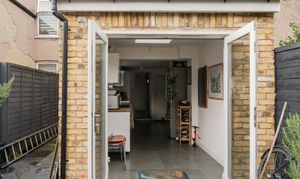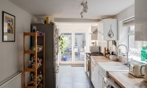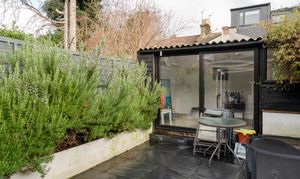Inside, an open-plan double reception room flows through to a stylish modern kitchen extension, which in turn opens onto a low-maintenance rear garden complete with a studio –ideal for working from home or as a creative retreat. Upstairs, two bedrooms are served by a modern family bathroom.