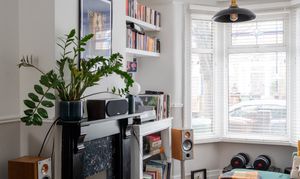 The walls are painted white above the dado and a soft light grey below, creating a crisp, contemporary feel that respects the Victorian architecture. A feature fireplace with a black mantelpiece provides a handsome focal point, and in one alcove, chunky built-in shelving and a storage unit offer both display space and practicality.