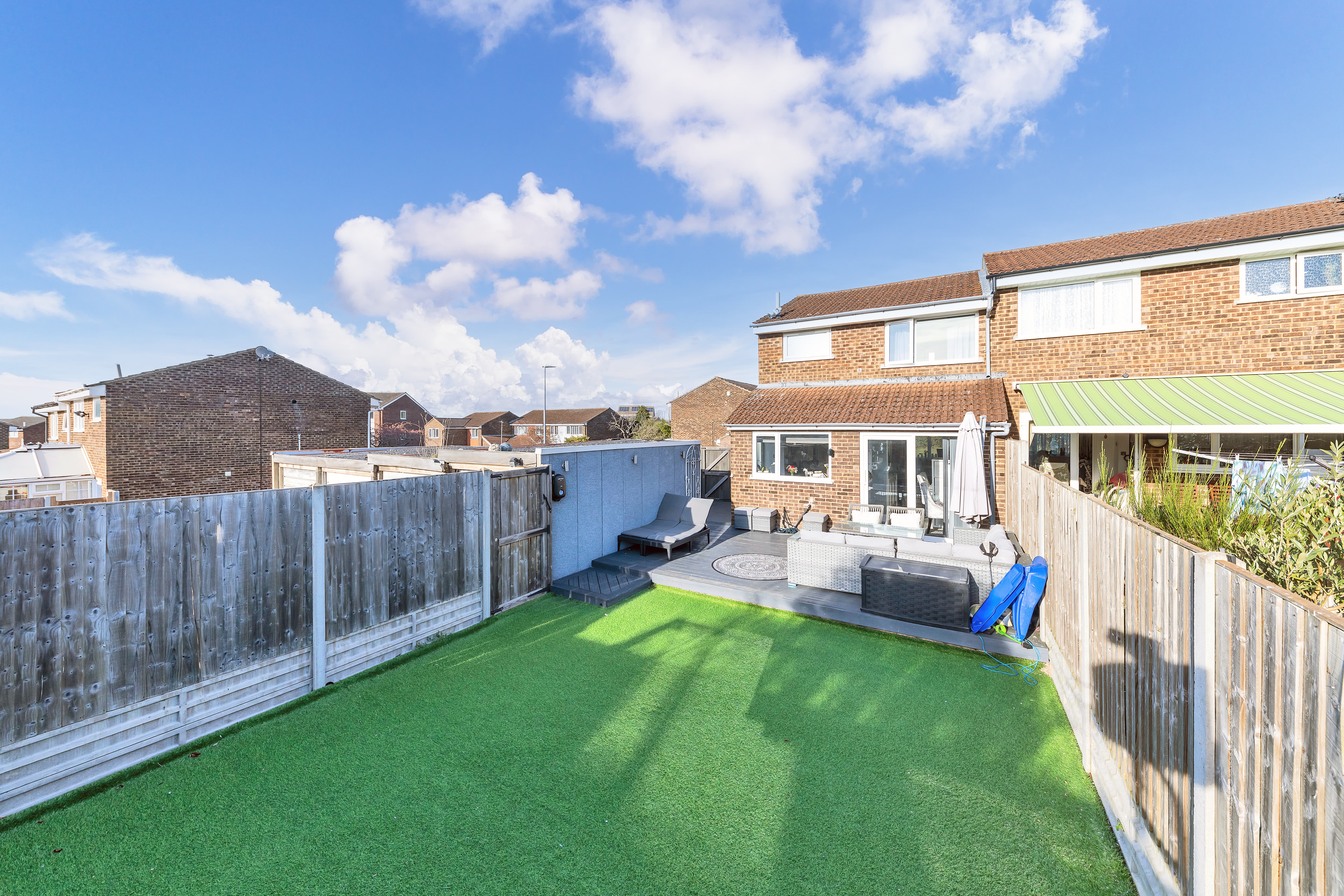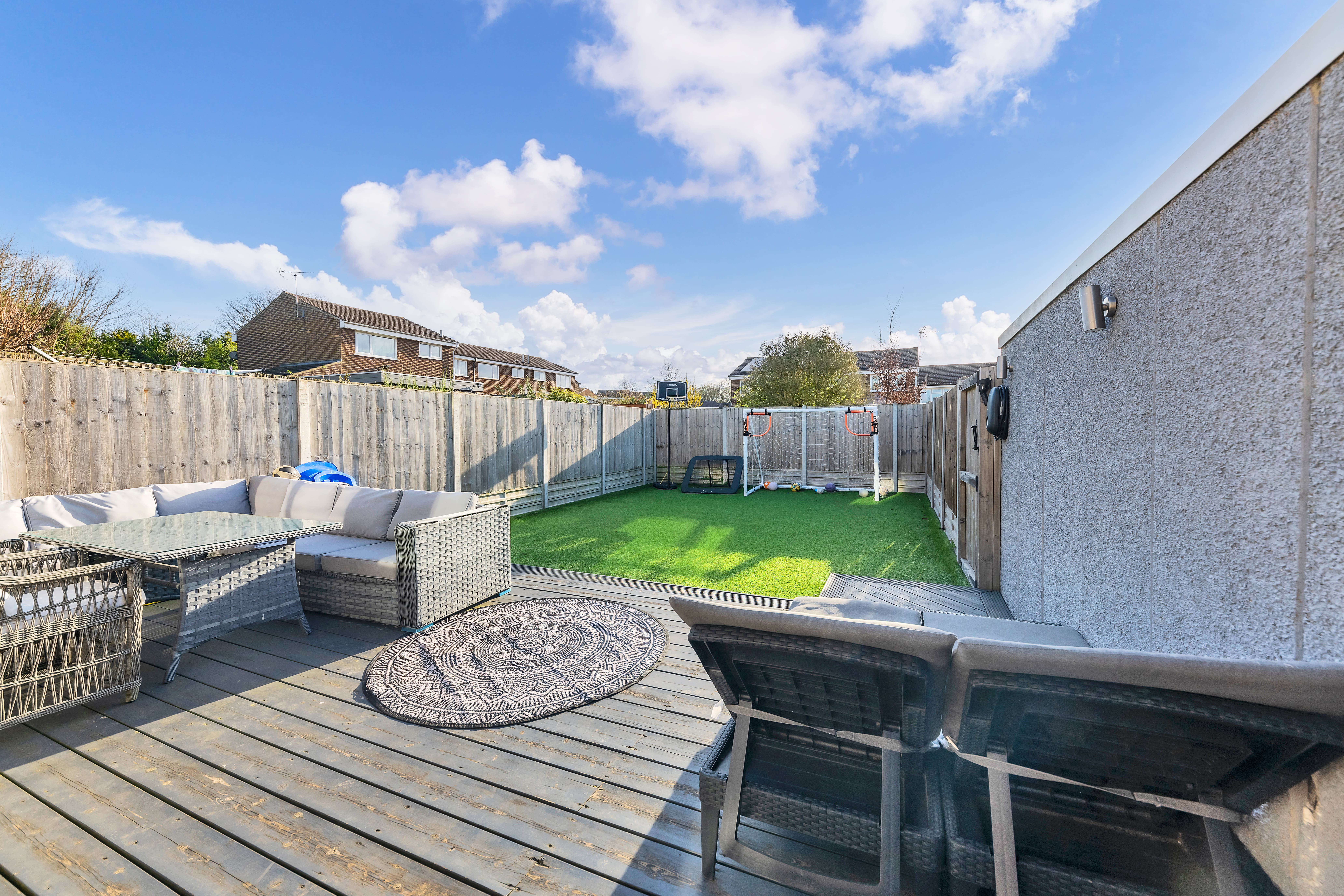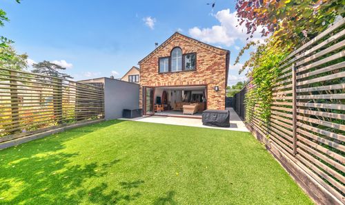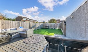 Outside to the rear, the landscaped west-facing garden is a good size, fully enclosed by fencing and offering a lovely spot to sit to relax in the warm weather. It is laid mainly to artificial lawn, with a large decking area by the house, providing ample space for garden furniture, cooking meals al fresco and entertaining guests. There is gated access to the side of the house and the garage as well as front access where there is an EV charger fitted, and plenty of scope for new owners to put their own touches on things.