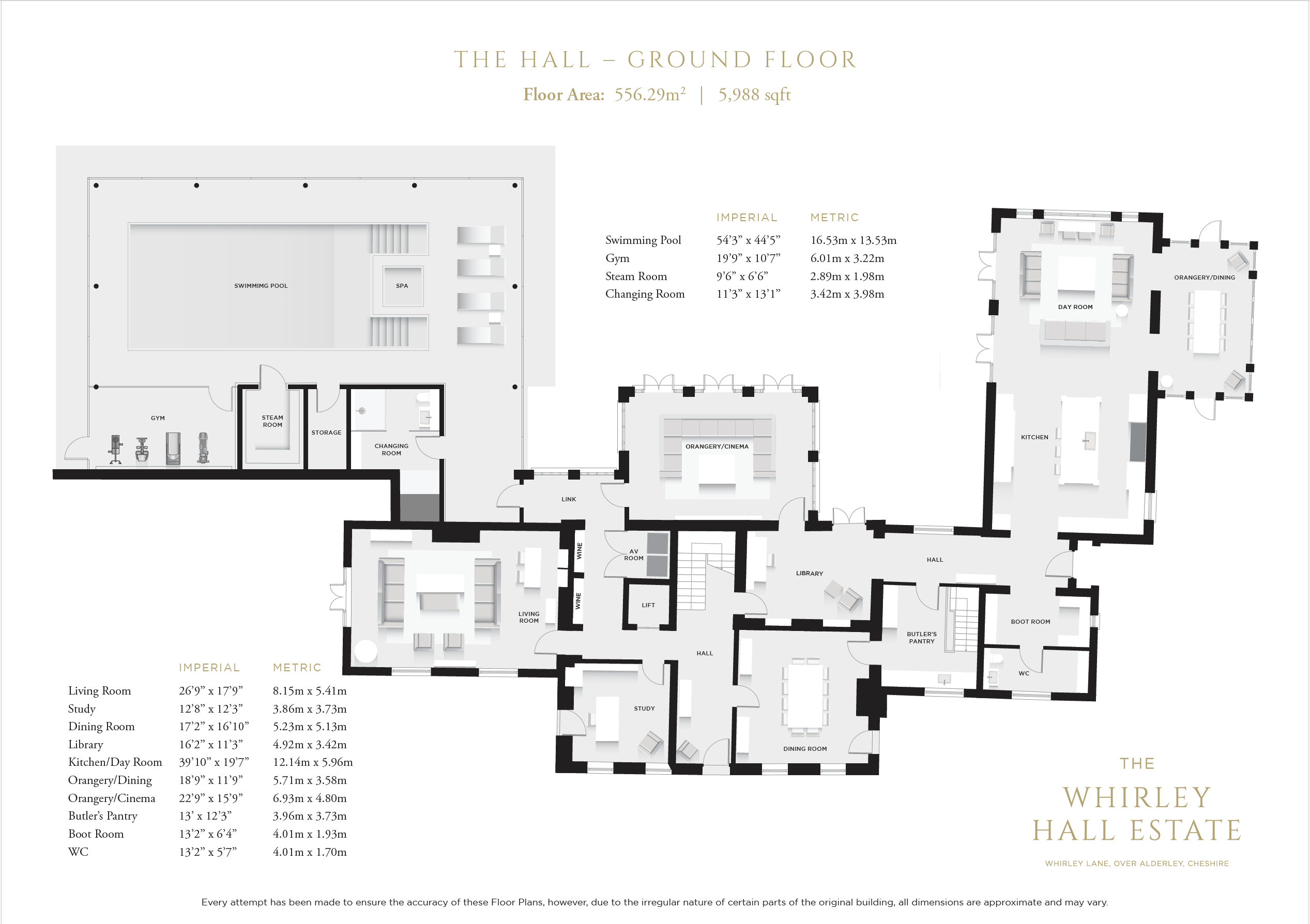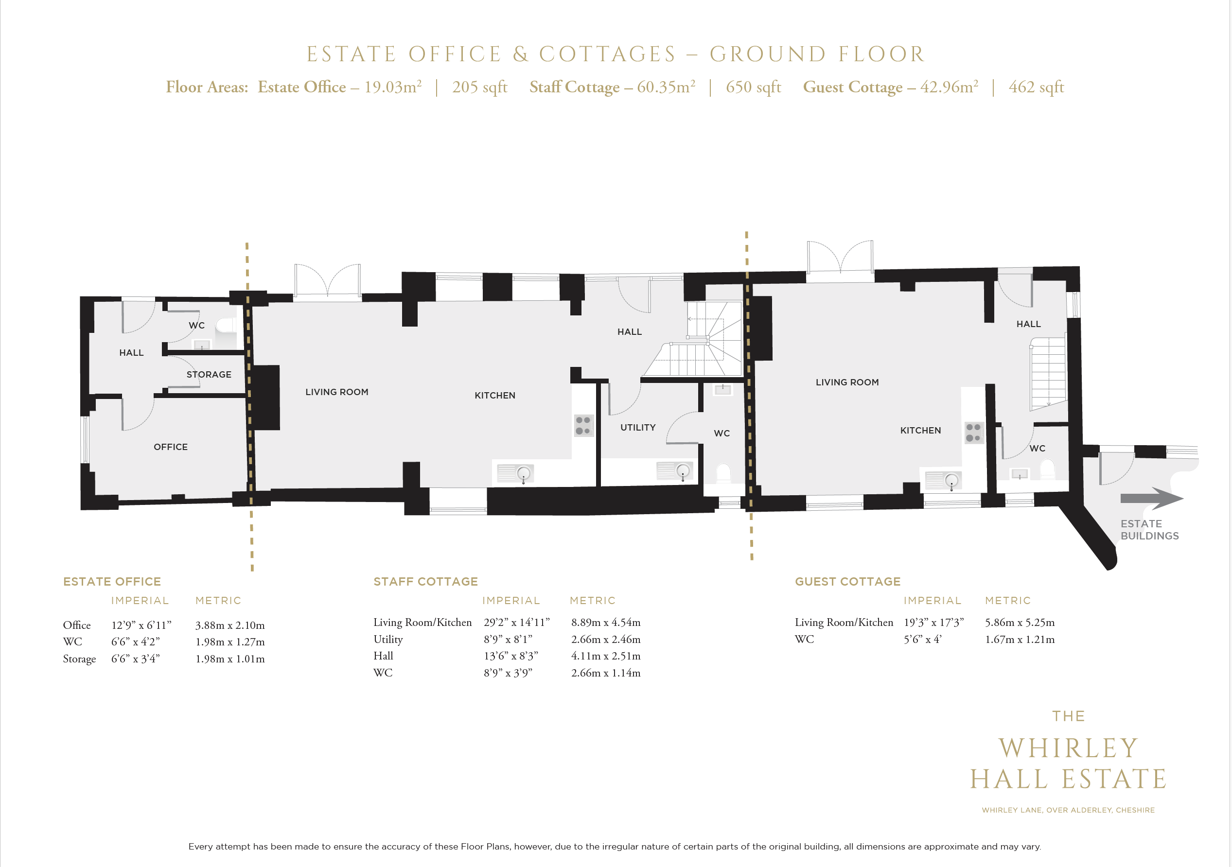 Hall - 9017 square feet - Cottages and estate office - 2274 square feet - Outbuildings and garaging - 2923 square feet - IN ALL 14,214 SQUARE FEET.