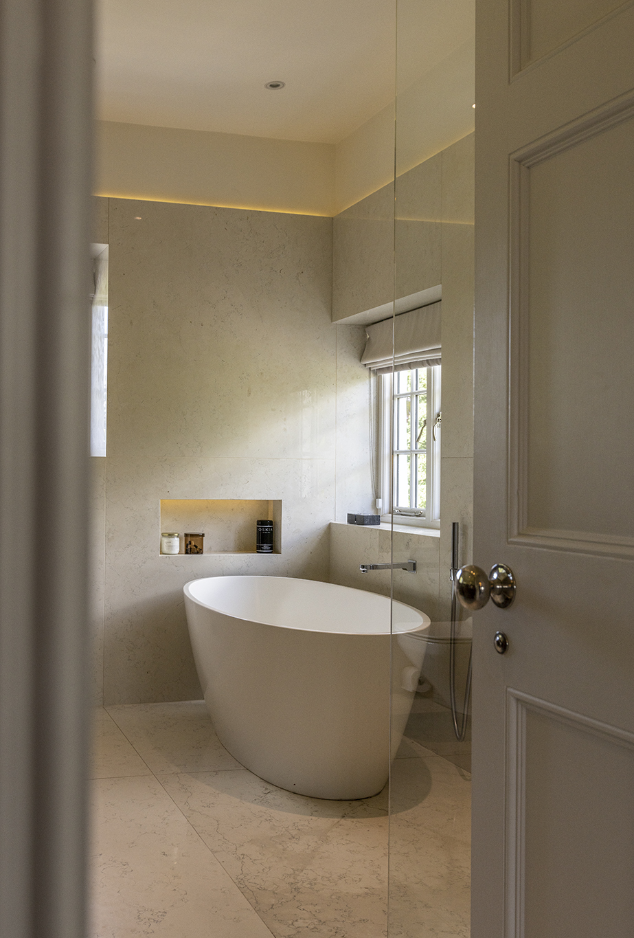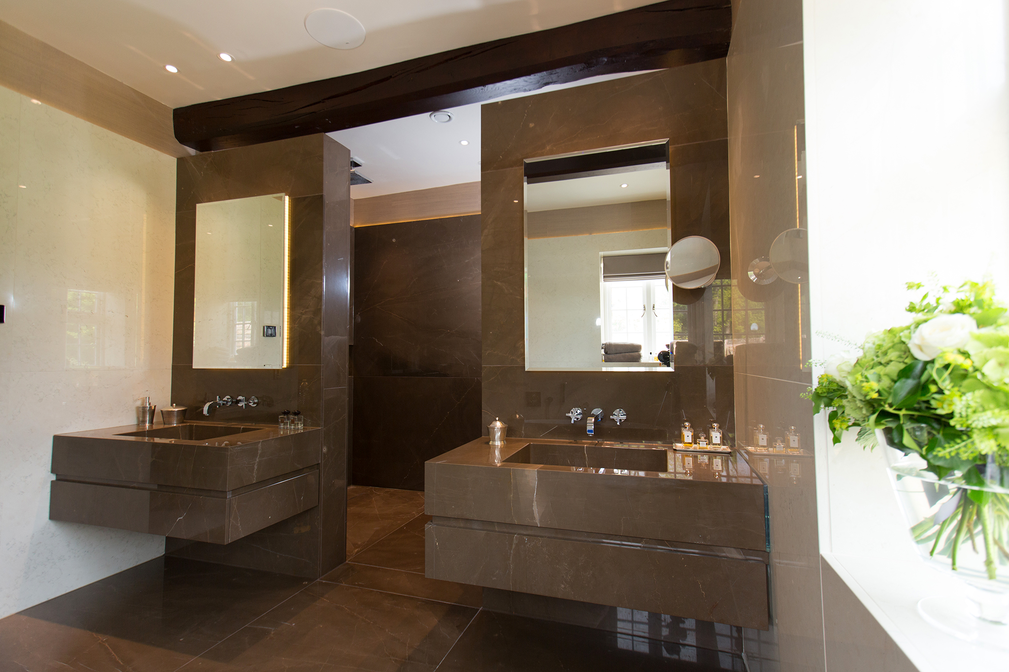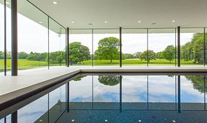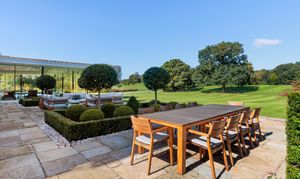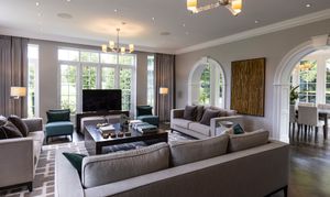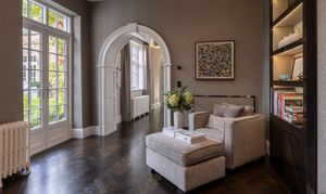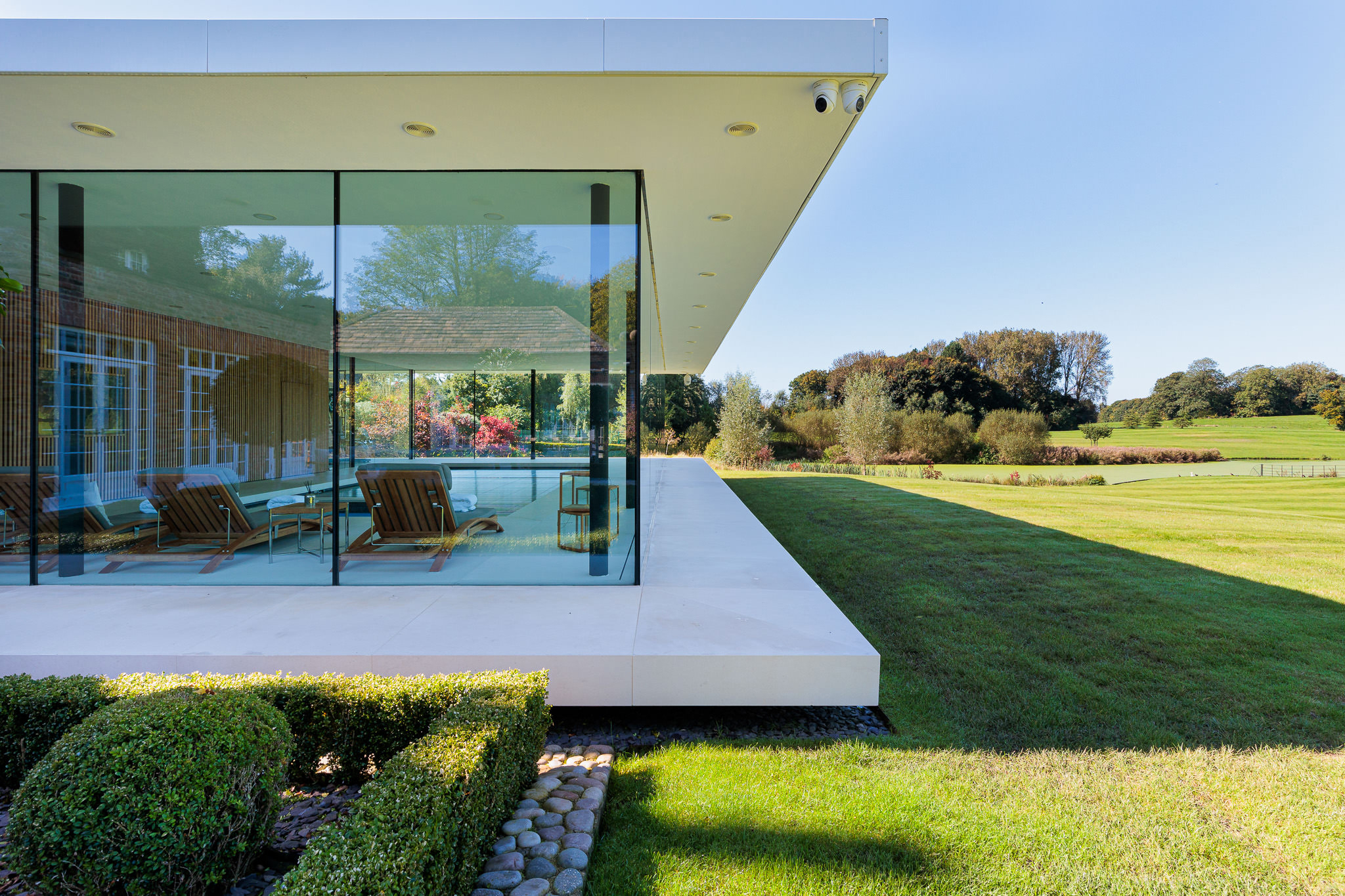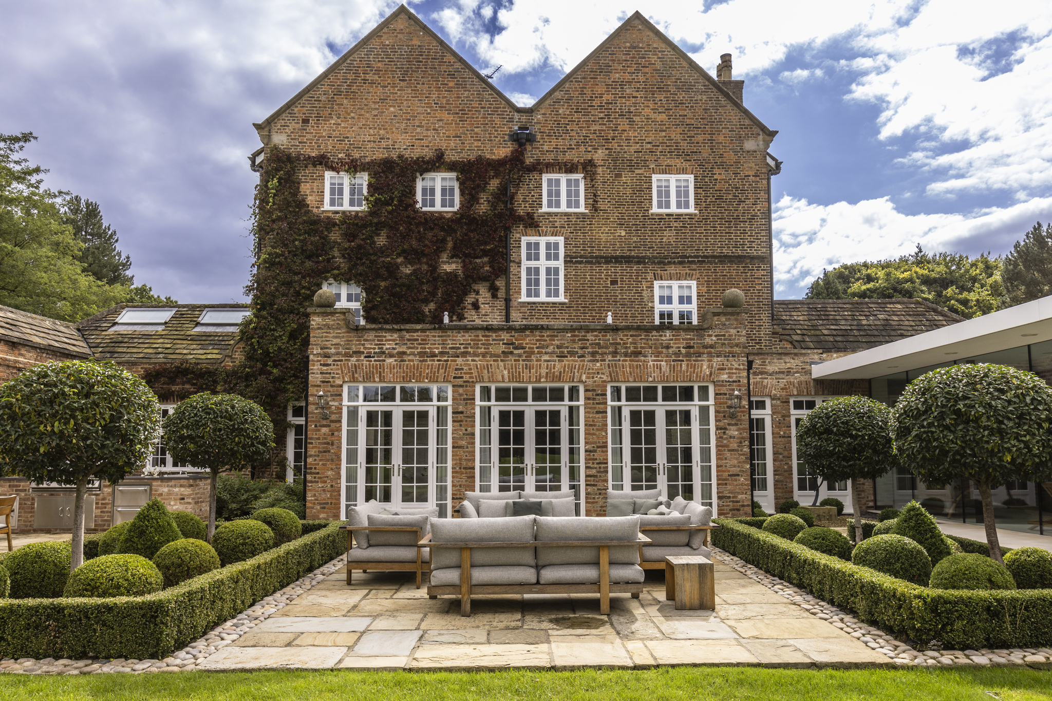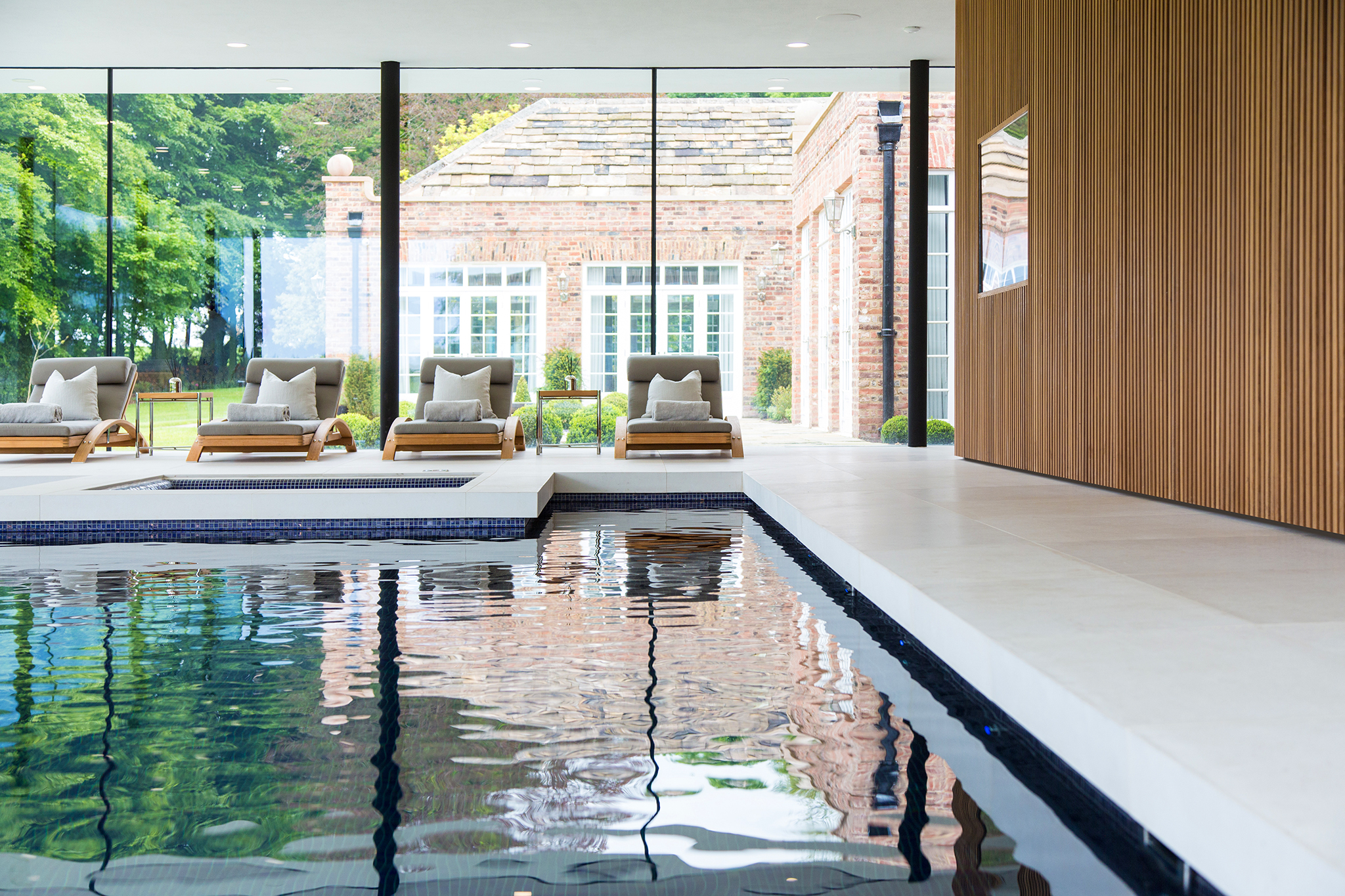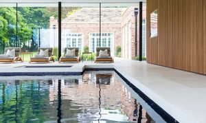 On the ground floor, a series of high-ceilinged reception rooms each serve a different purpose: a place for dining and sitting, a library for reading, a cinema room for watching films. The floors are laid with oak parquet, countertops in Arabescato Corchia marble define the kitchen and in the dining room, seagrass-lined walls add to the feeling of warmth. On the first and second floors are four bedrooms; the principal suite appointed with bespoke cabinetry in lacquered Macassar ebony, and the bathrooms are Armani Brown & Botticino marble. It is the glass-walled contemporary leisure suite that really thrills, where the floor-to-ceiling glass harmonises with the period architecture and reflects the ever-green surrounds.