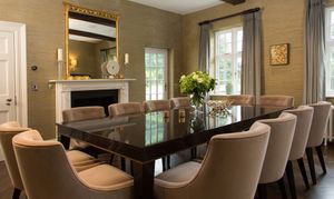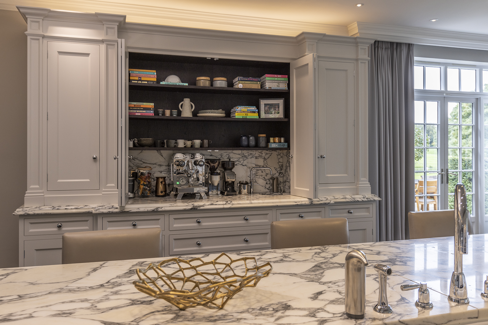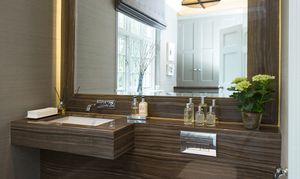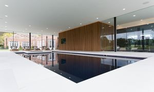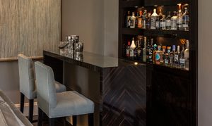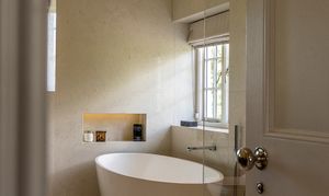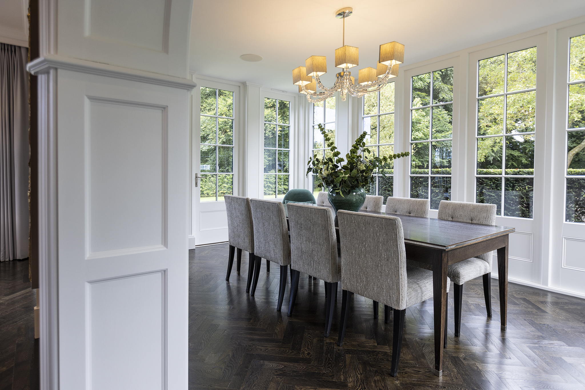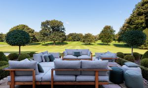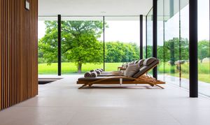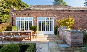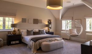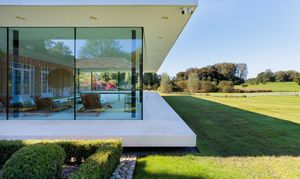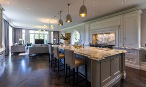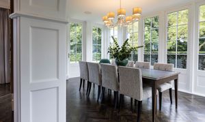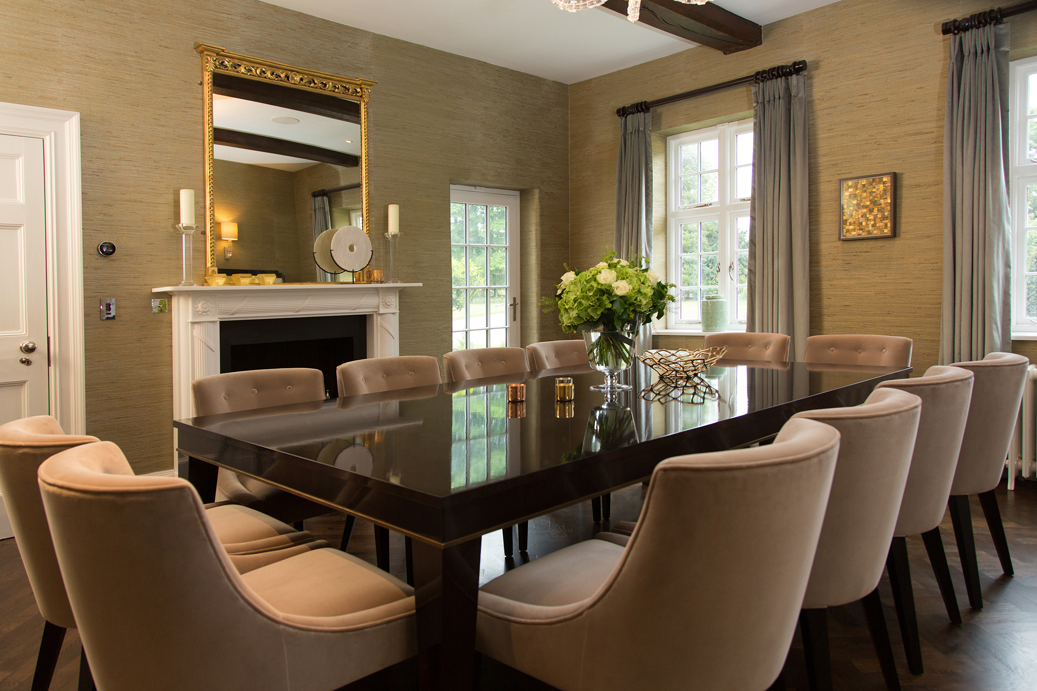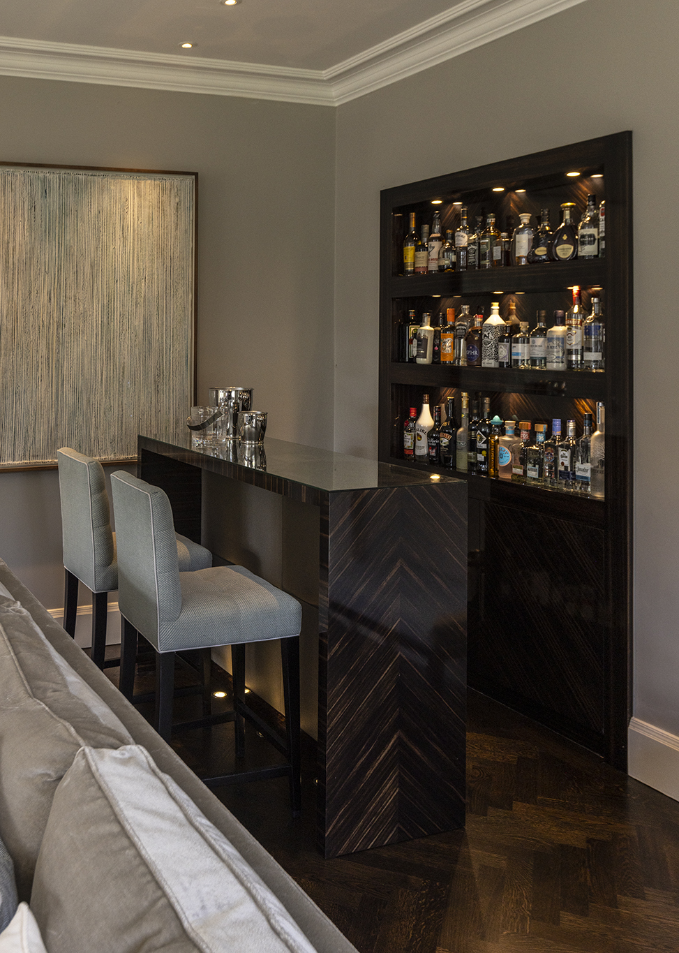 On the ground floor, a series of high-ceilinged reception rooms each serve a different purpose: a place for dining and sitting, a library for reading, a cinema room for watching films. The floors are laid with oak parquet, countertops in Arabescato Corchia marble define the kitchen and in the dining room, seagrass-lined walls add to the feeling of warmth. On the first and second floors are four bedrooms; the principal suite appointed with bespoke cabinetry in lacquered Macassar ebony, and the bathrooms are Armani Brown & Botticino marble. It is the glass-walled contemporary leisure suite that really thrills, where the floor-to-ceiling glass harmonises with the period architecture and reflects the ever-green surrounds.