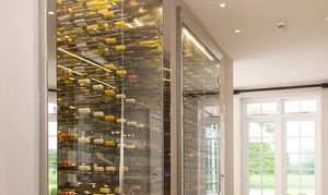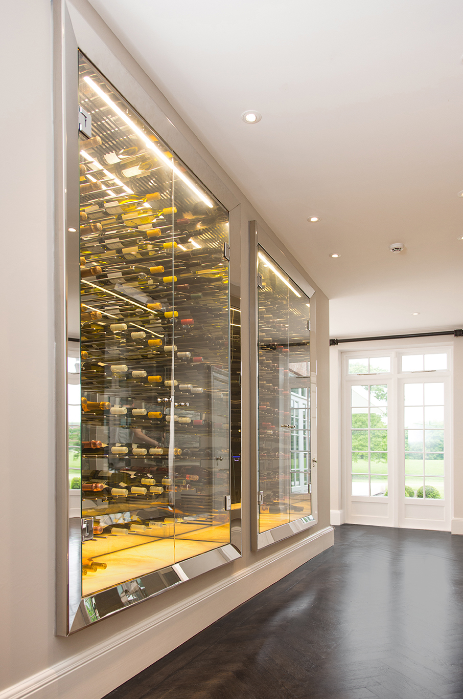 Wine Storage - Bespoke custom mirrored wine storage wall, with translucent backlit onyx bases. Wine Guardian temperature control.