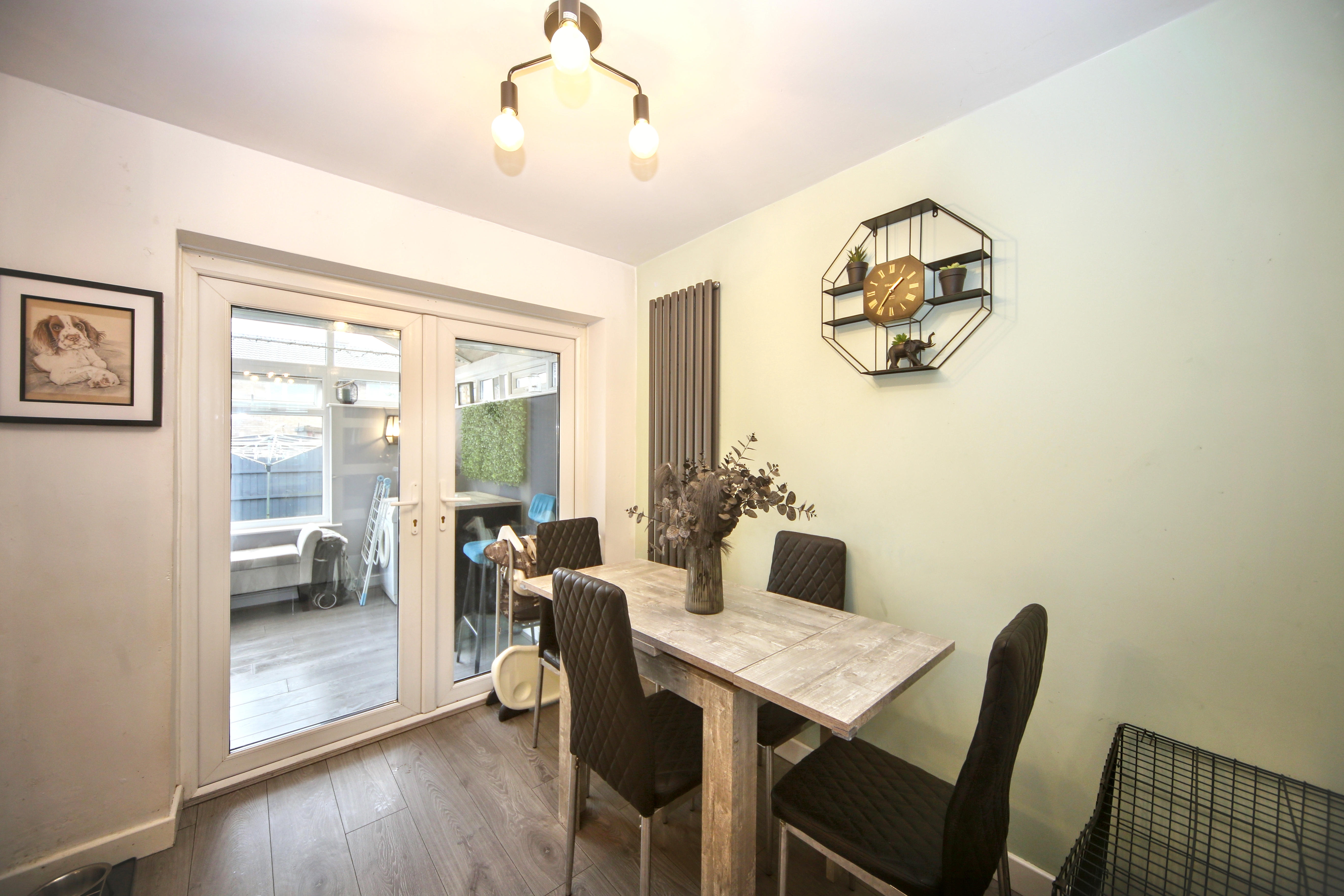 Upstairs comprises two well-proportioned double bedrooms, a single bedroom, and a modern family bathroom. Externally, the property enjoys a well-kept garden with a patio area and lawn, perfect for outdoor relaxation.