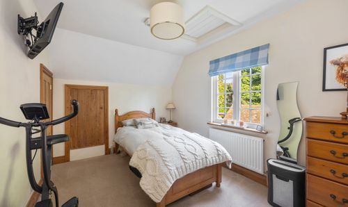 The turning staircase leads to the first floor where the main bedroom enjoys views over the rear gardens it has a selection of fitted wardrobe space and a well equipped ensuite bathroom. The ensuite has a walk-in shower which is a remote pumped power showers with rain head, bath, wash handbasin and a low level WC; all finished to a modern style and complimented with chrome fittings. There are three further bedrooms with eaves storage to bedroom three plus a family shower room which is also a remote pumped power showers with rain head with a modern and contemporary finish with underfloor heating.