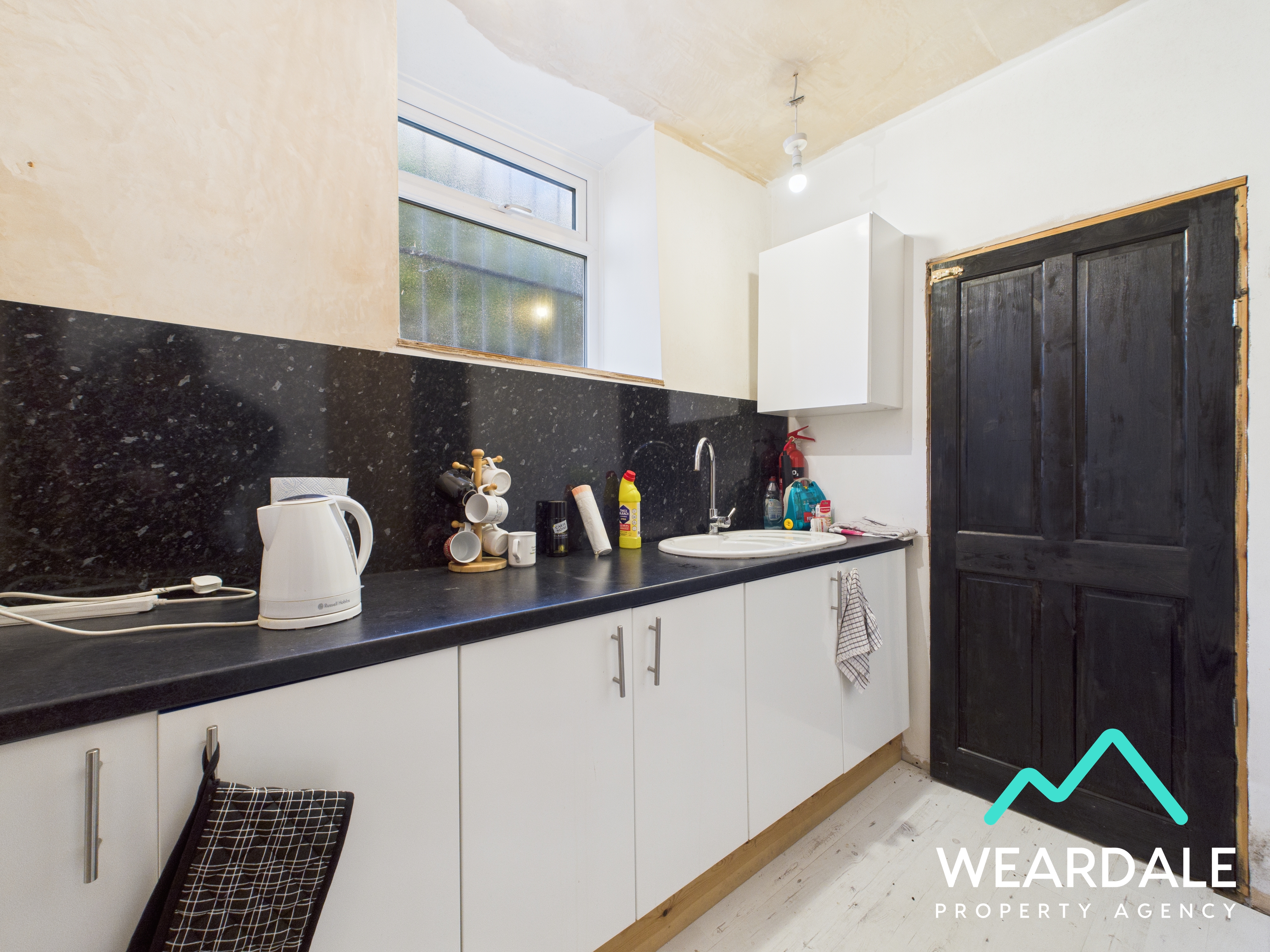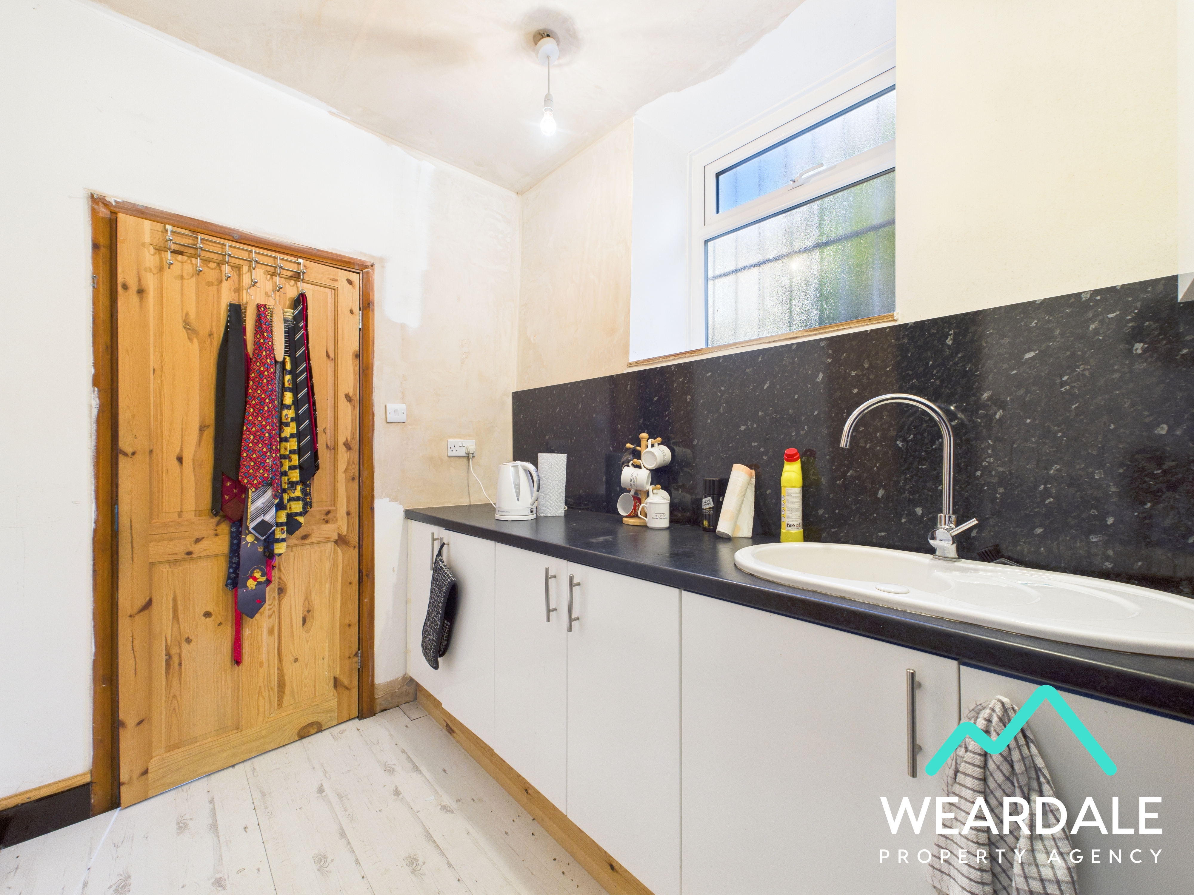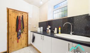 - Positioned to the rear of the property, internally accessed from the storeroom with onward internal access to the shower room. There is also external access to the side of the property via a wooden door - uPVC window to the Northern aspect with frosted pane - Laminate flooring - Composite sink - Laminate worksurface with panelled splashback - Under counter storage units - Ceiling mounted light fittings - There is an electric hot water heater in one of the undercounter storage units which provides hot water to the kitchen sink and the hand wash basin in the shower room
