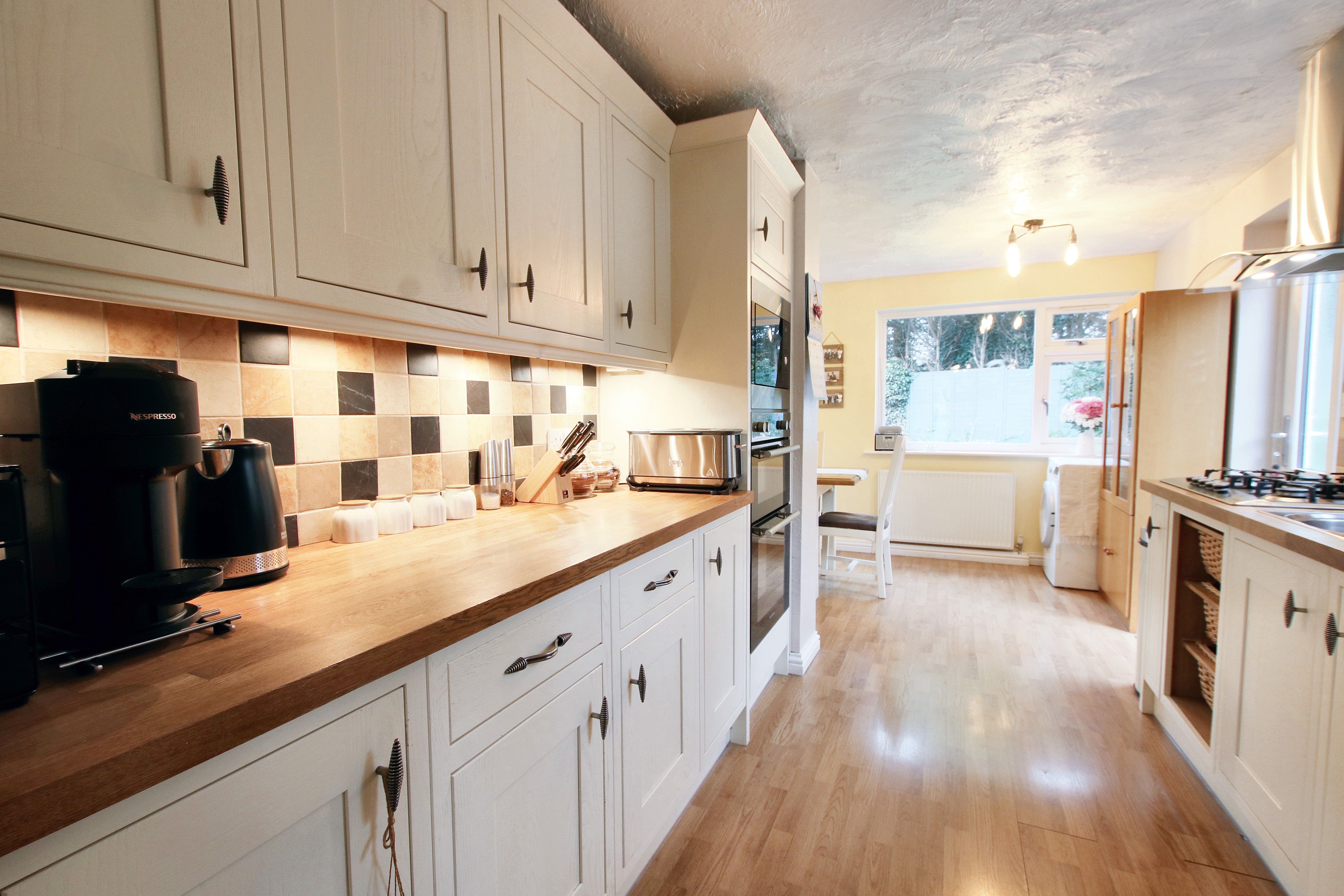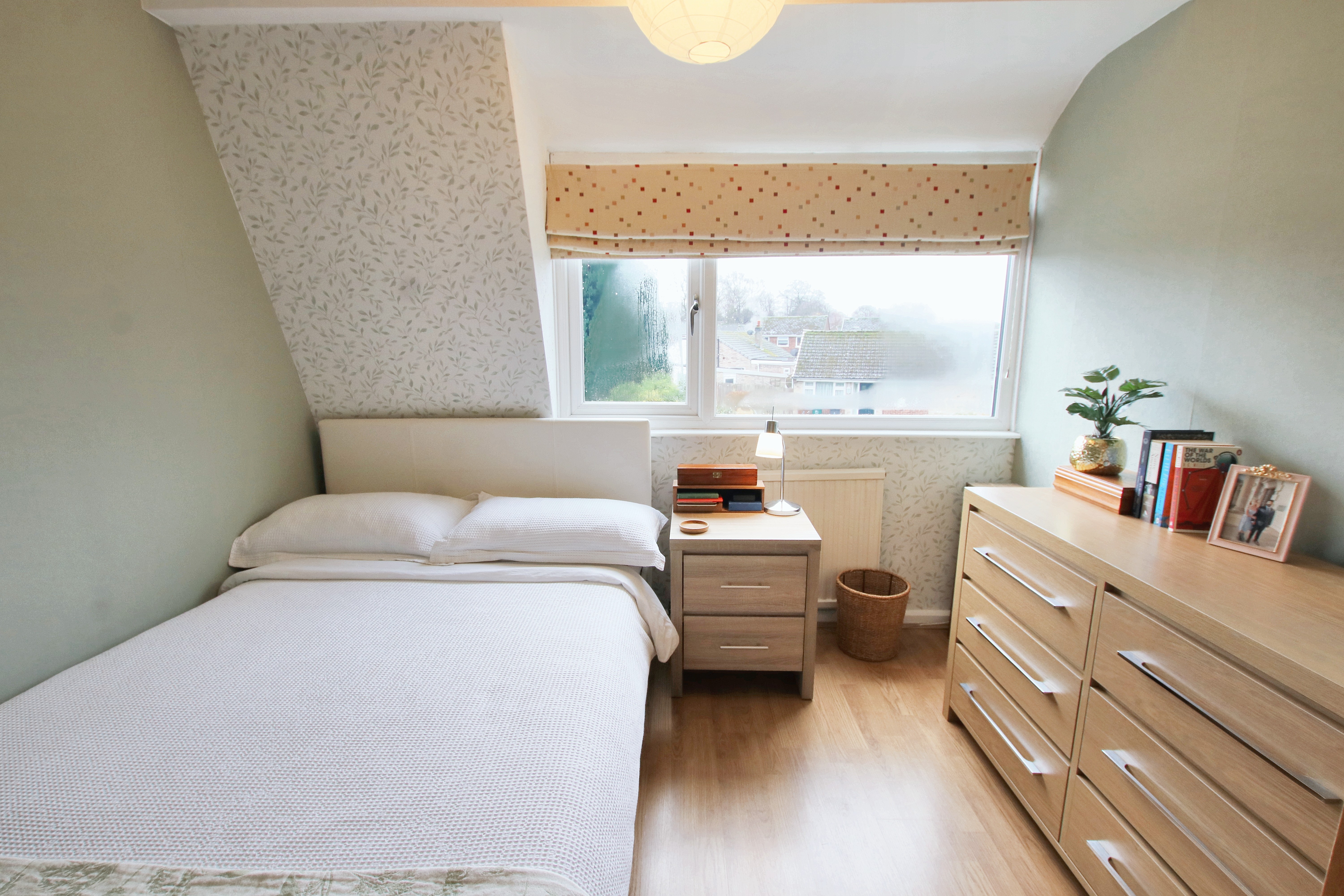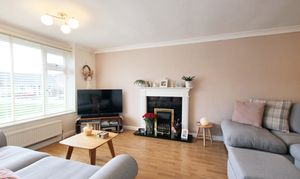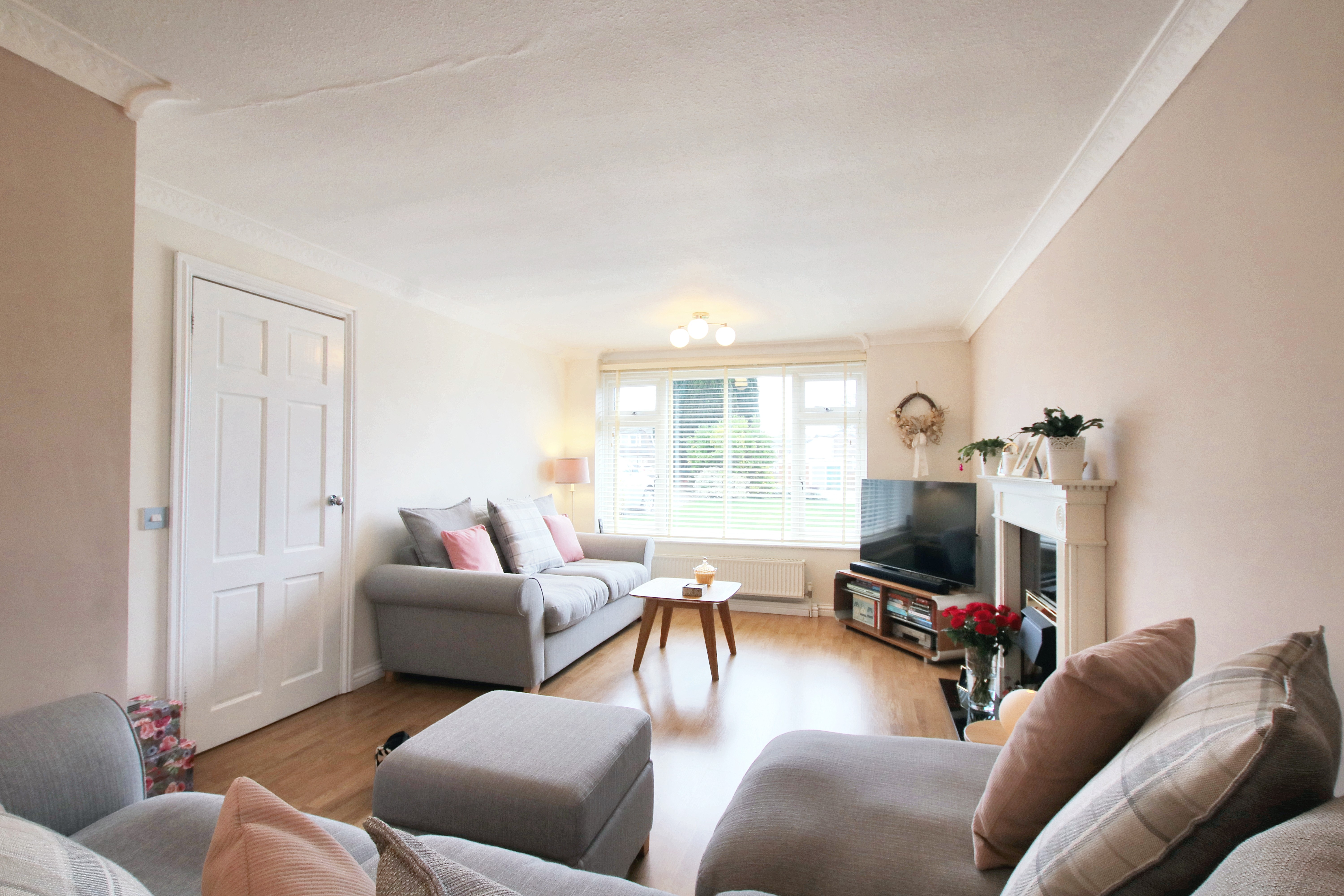 The galley kitchen flows beautifully into the dining space at the back of the house. I love how the two garden-facing windows and side access keep it light and airy, while the double doors open into the living-dining area, making the whole space feel versatile and connected. The living room is another favourite of mine, with its large bay window looking out over the front lawn, it’s a lovely view and brings in so much natural light.