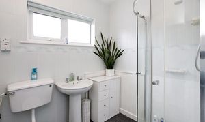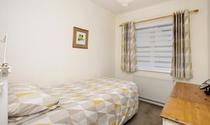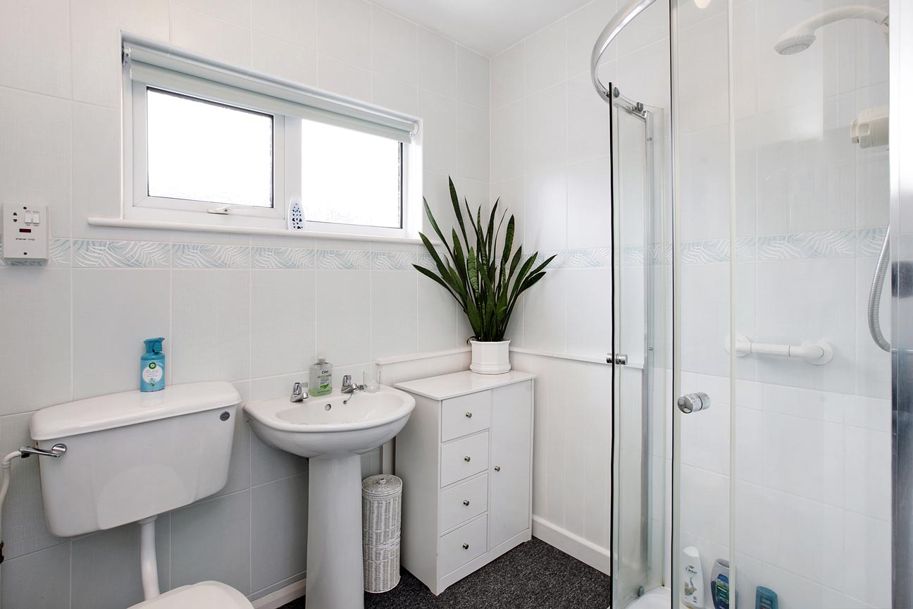 An internal door leads to an inner hall, where there is an airing cupboard housing the hot water tank, along with access to the loft space. There are two double bedrooms overlooking the rear garden—one of which features a door opening onto a decked seating area—as well as a further single bedroom. The shower room is fitted with a contemporary white suite comprising a WC, wash basin, and a shower cubicle with mains-fed shower.