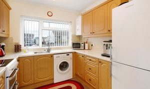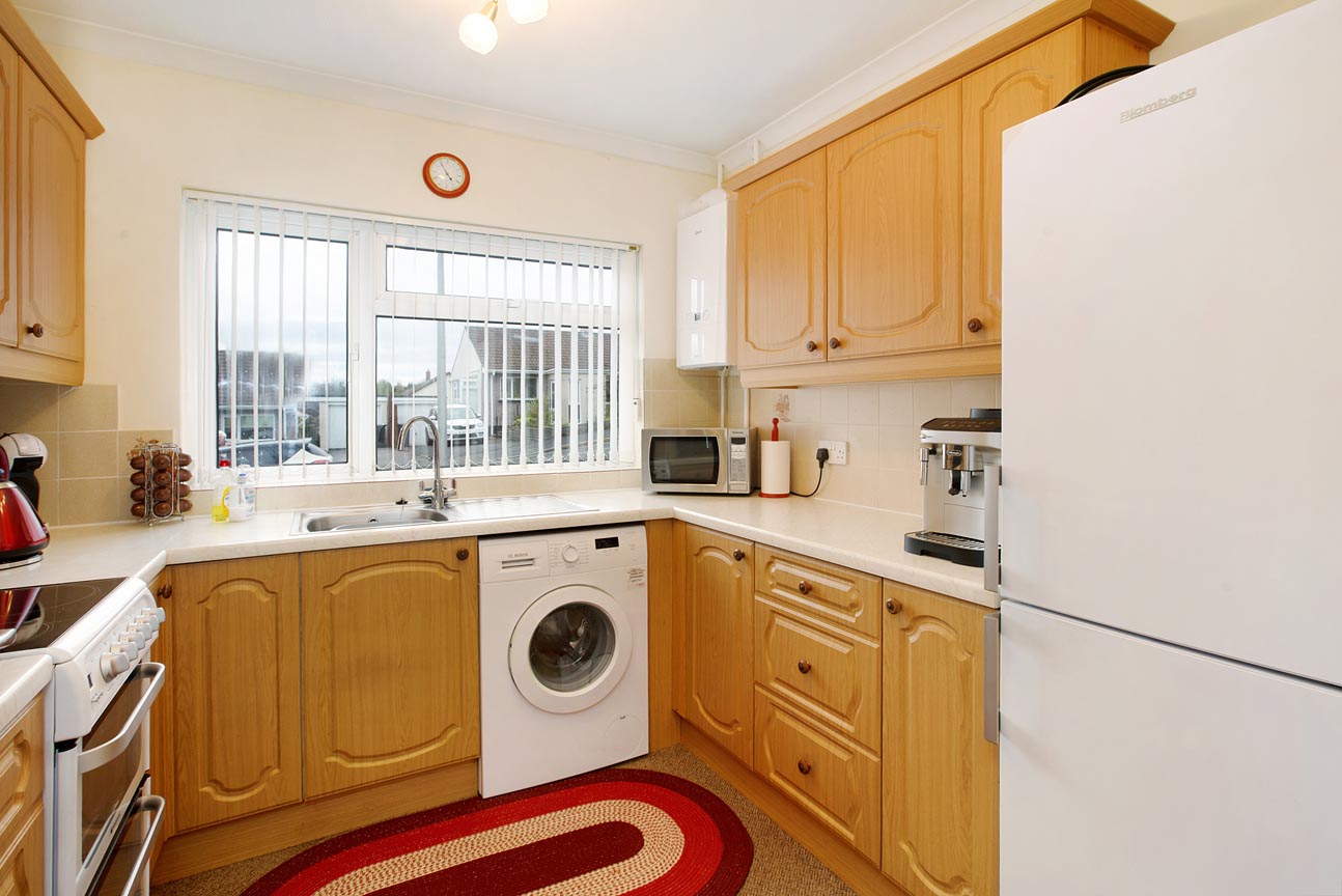 The front door is positioned to the side of the property and is accessed via a practical porch area. From here, the entrance hall leads into the kitchen, which is well-equipped with a range of fitted cupboards, space for a washing machine and fridge/freezer, and a freestanding electric cooker which will remain for the new owner. A wall-mounted gas boiler is also located here.