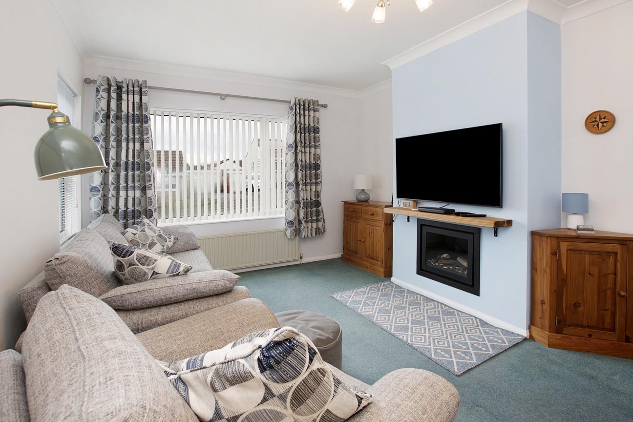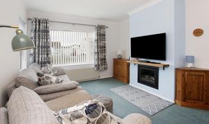The living room benefits from dual-aspect windows, allowing for an abundance of natural light and enjoying attractive countryside views. A modern electric fire is inset within the fireplace, which offers potential to be opened up to accommodate a wood-burning stove if desired.