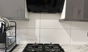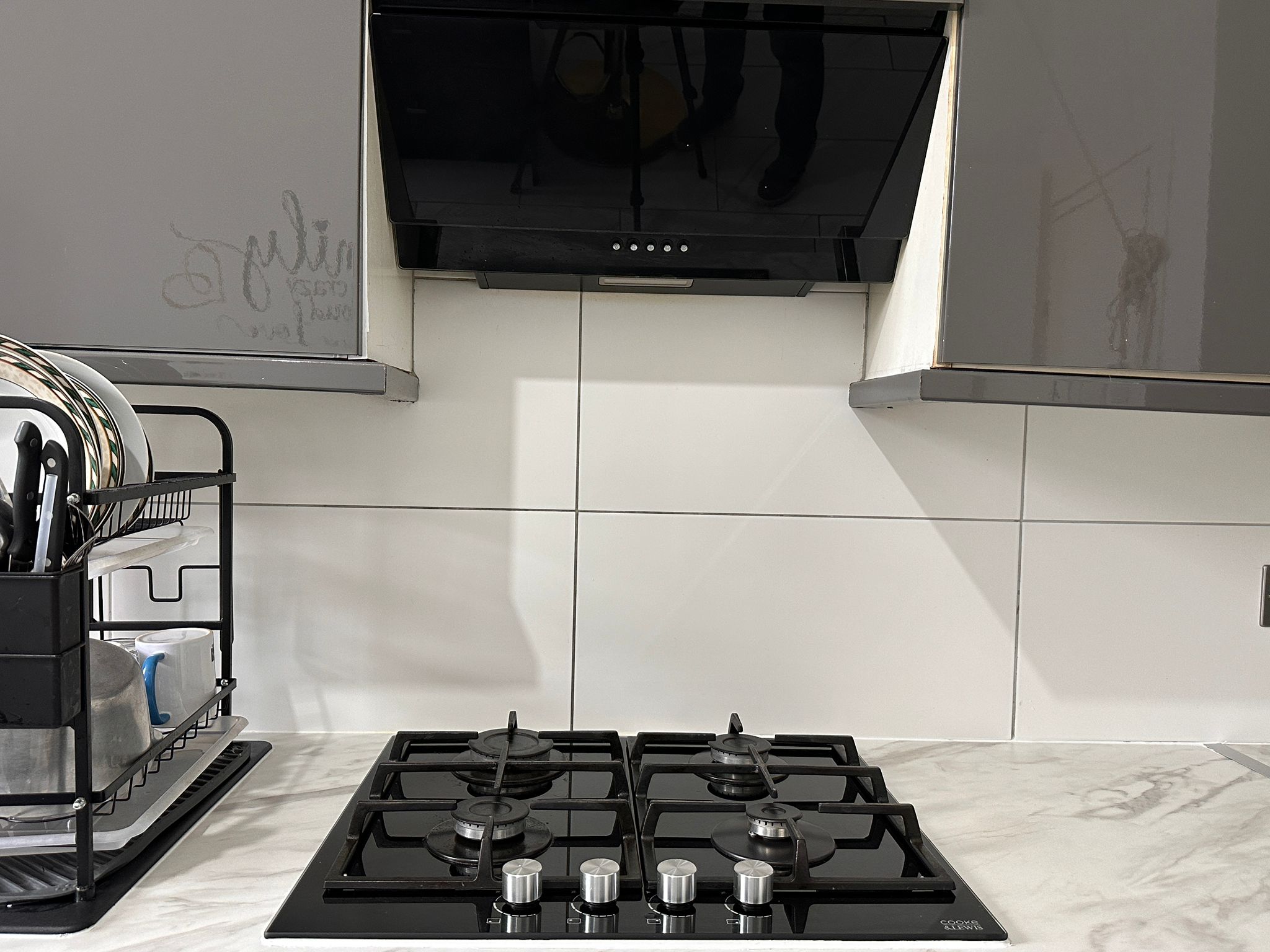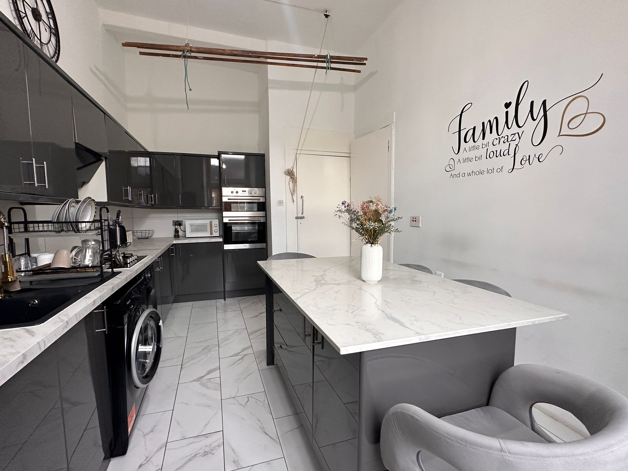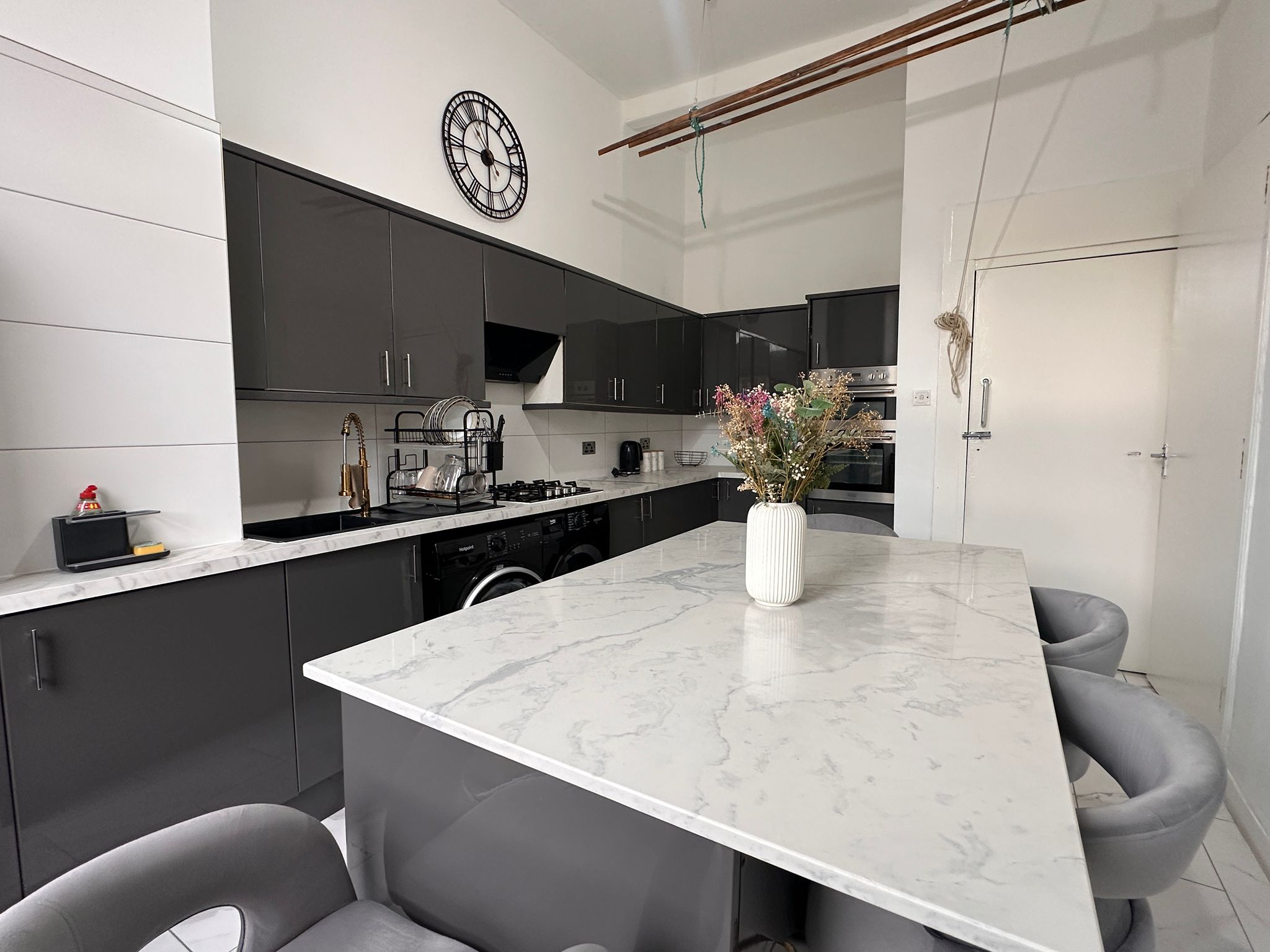 The modern fitted kitchen is equipped with high quality appliances and sleek cabinetry, designed to meet the demands of modern living while offering a stylish environment for cooking and entertaining.
