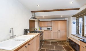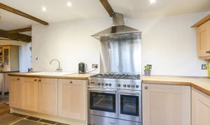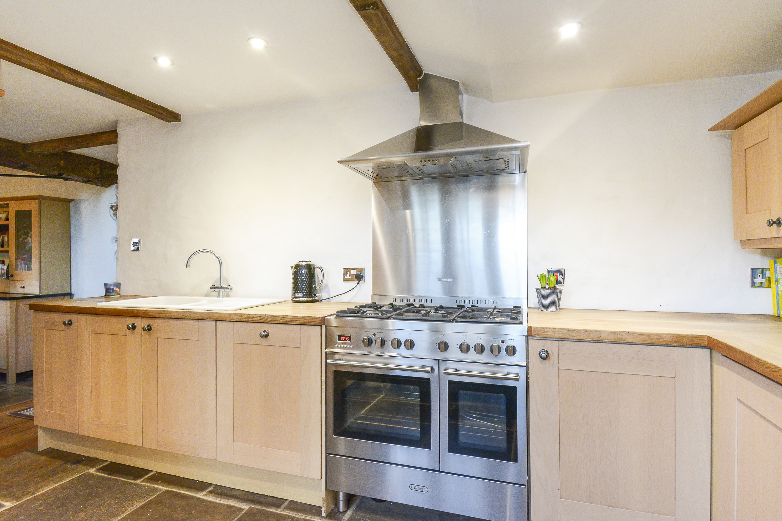With a three light stone mullioned window and stone sill, beamed ceiling with inset LED downlighters, contemporary radiator with oak plinth over, stone flagged floor and fitted with a range of shaker style base and wall cupboards, drawers, these are complimented by overlying oak worktops with an inset one and a half bowl single drainer sink with chrome mixer tap, there is a DeLonghi stainless steel range style cooker with a five ring gas hob and an electric double oven beneath together with a stainless steel extractor hood over, integrated fridge, integrated freezer, and integrated dishwasher.