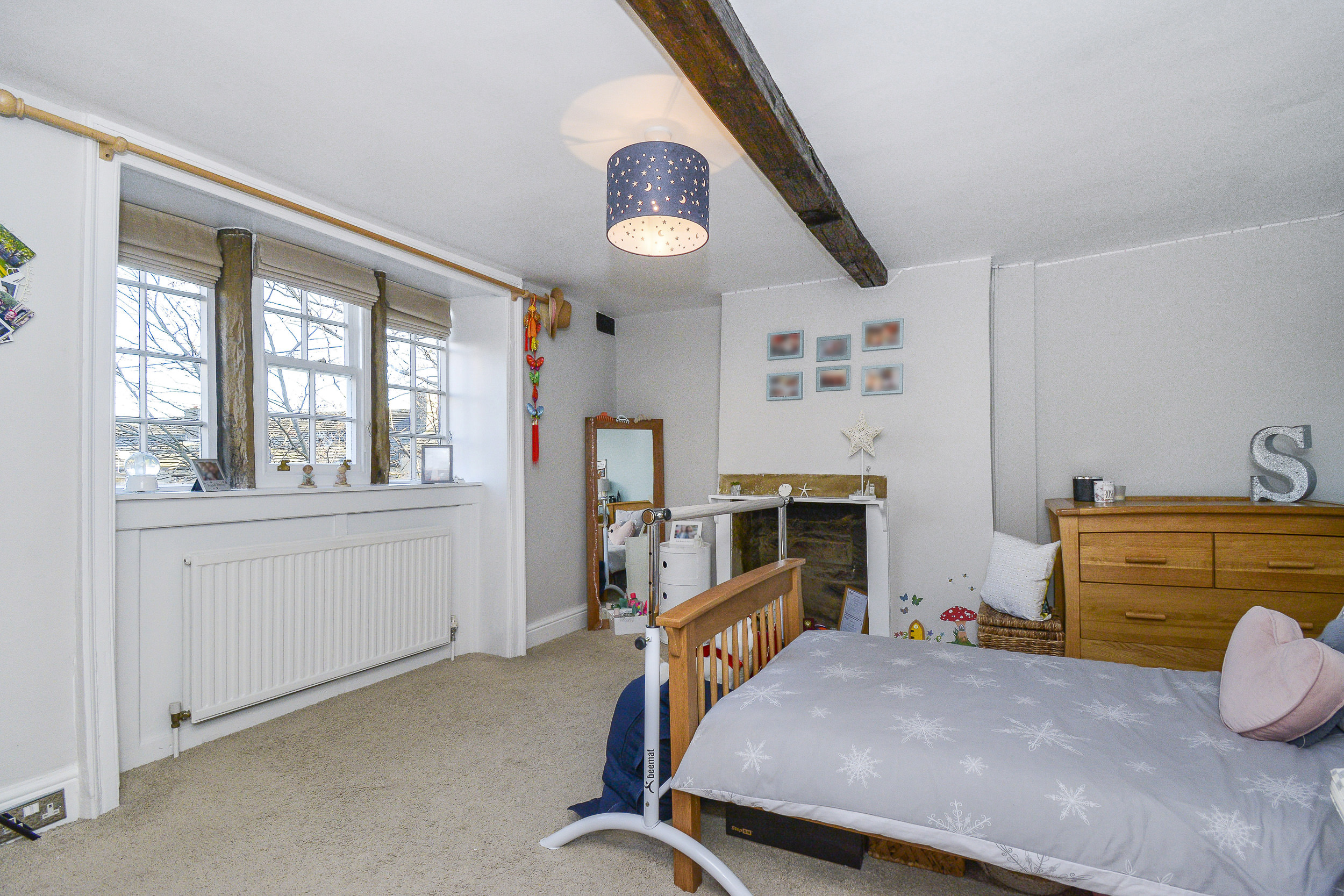 A good size double room with a three light stone mullioned windows looking out to the rear, there is a beamed ceiling with ceiling light point, central heating radiator and chimney breast with surround and stone inset.