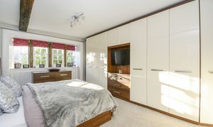 A generous double room which has a bank of four light stone mullioned windows, beamed ceiling with ceiling light point, central heating radiator and to one wall there are fitted wardrobes and drawers.