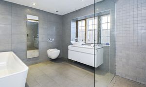 With a three light stone mullioned window, inset LED downlighters, beamed ceiling, chrome ladder style heated towel rail, floor to ceiling tiled walls, tiled floor with underfloor heating and fitted with a stylish modern suite comprising: - free standing Villeroy and Boch bath, wall hung vanity unit mounted Villeroy and Boch wash basin with Villeroy and Boch monobloc tap, wall hung Villeroy and Boch w.c. with concealed cistern and a large walk-in shower with glazed panel, fixed shower rose and separate hand spray