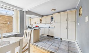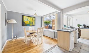 - Bright and spacious open-plan dining kitchen with timber-finish units and integrated appliances