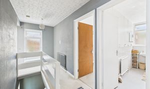 Upstairs, the first floor landing leads to three bedrooms and offers plenty of space for family, guests or home working. The bathroom includes a white suite with electric shower and is complemented by a separate WC.