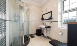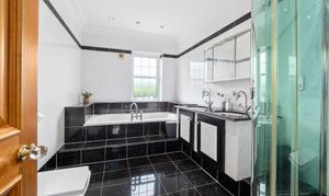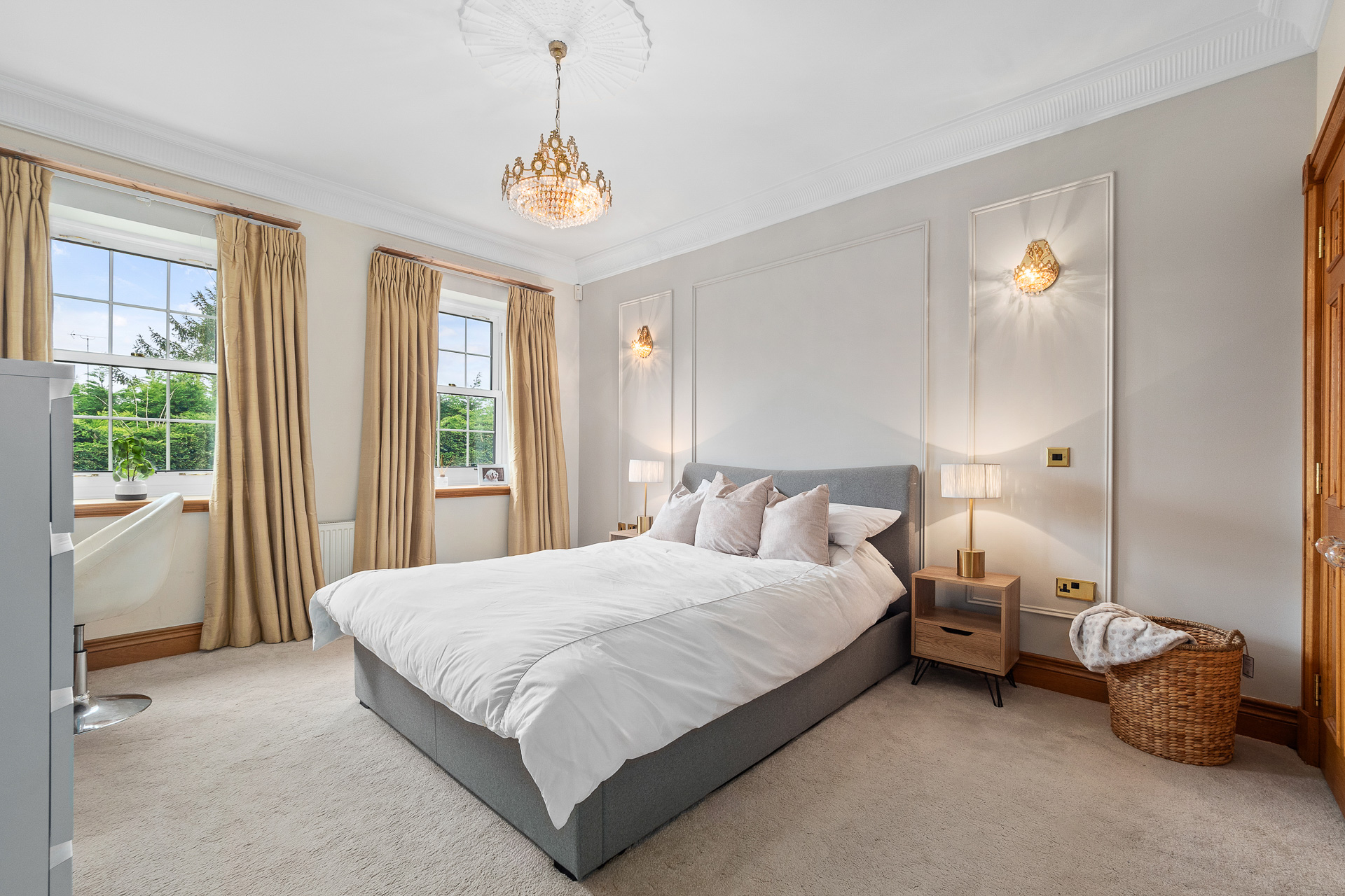 Ascending the grand staircase to the first floor, you're greeted by a galleried landing leading to four spacious double bedrooms, three of which boast en-suite facilities, alongside a main family bathroom. The principal suite, occupying the left wing, features a built-in dressing room and expansive windows offering panoramic views.