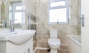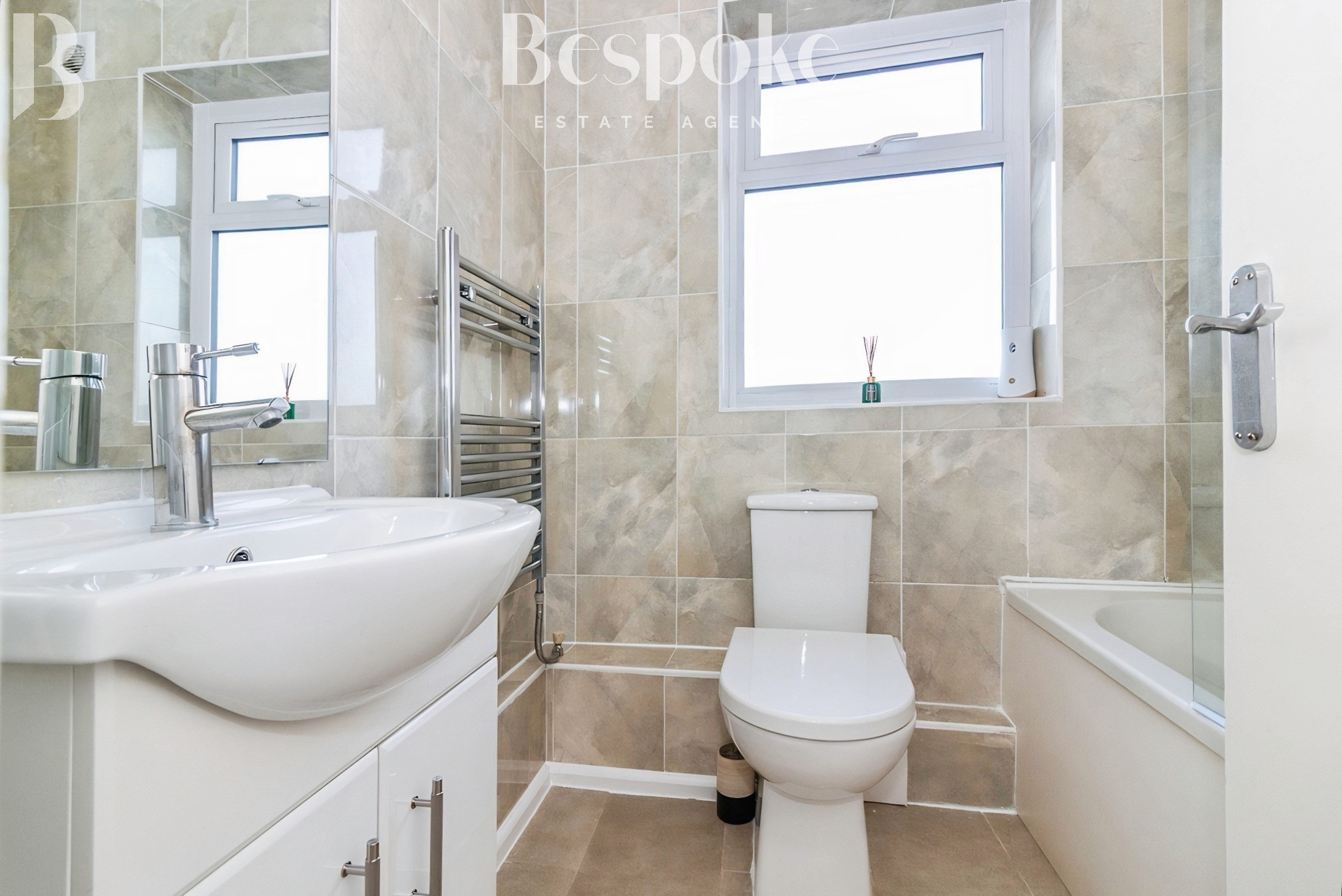 The bathroom is located at the rear of the property and is finished in a clean, contemporary style. Fully tiled in neutral tones, it features a modern white suite comprising a panelled bath with glass shower screen and overhead shower, WC, and wash basin set within a vanity unit providing useful storage. A rear aspect window allows for natural light and ventilation, while a heated towel rail adds everyday comfort. The space is well laid out and neatly presented, continuing the fresh, move-in-ready feel seen throughout the ground floor.