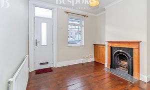 The living room is a welcoming and characterful space, positioned at the front of the property and finished in a calm, neutral palette following recent redecoration. A standout feature is the original cast iron fireplace, complete with timber surround and tiled hearth, which remains fully working and provides a beautiful focal point to the room. The room enjoys good natural light from the front aspect window, complemented by high ceilings and crisp white woodwork that enhance the sense of space. The layout comfortably accommodates a range of living furniture, with the proportions lending themselves well to both relaxed seating and occasional home working if required. Original timber floorboards add warmth and character underfoot, while a useful built-in storage cupboard provides practical everyday storage. A modern front door with glazed panel, and picture window allows additional light into the space, creating an inviting first impression on arrival.