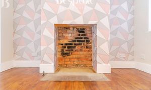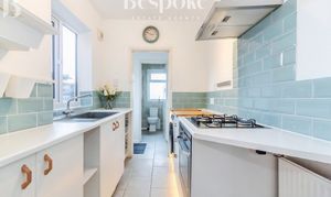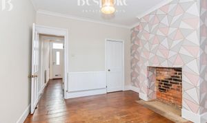 Located at the heart of the ground floor, the dining room is a bright and versatile space, ideal for everyday dining and entertaining. Recently redecorated in soft, neutral tones, the room is enhanced by a striking feature chimney breast, finished with contemporary geometric wallpaper that adds character while complementing the home’s period proportions. An exposed brick fireplace recess creates an attractive focal point and offers scope for a decorative feature. Natural light is provided by the side aspect window, giving the room a pleasant and welcoming feel. The room comfortably accommodates a dining table and chairs, with original timber floorboards continuing through from the living room. A useful under-stairs storage cupboard adds practicality, while a doorway leads directly through to the kitchen, creating a well-balanced and functional ground floor layout.