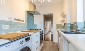 The kitchen is positioned to the rear of the property and is arranged in a practical galley style, making excellent use of the available space. Recently redecorated, it features modern white units complemented by white worktops and soft green metro-style tiled splashbacks, creating a clean and contemporary finish. Integrated appliances include a gas hob with extractor hood and electric oven, with space and plumbing for additional appliances. A side window provides good natural light, while the layout offers generous worktop space and storage along both sides. Tiled flooring underfoot ensures durability, and the overall presentation is fresh, neutral, and ready for immediate use. Door to lobby.