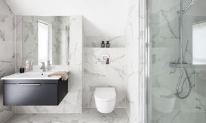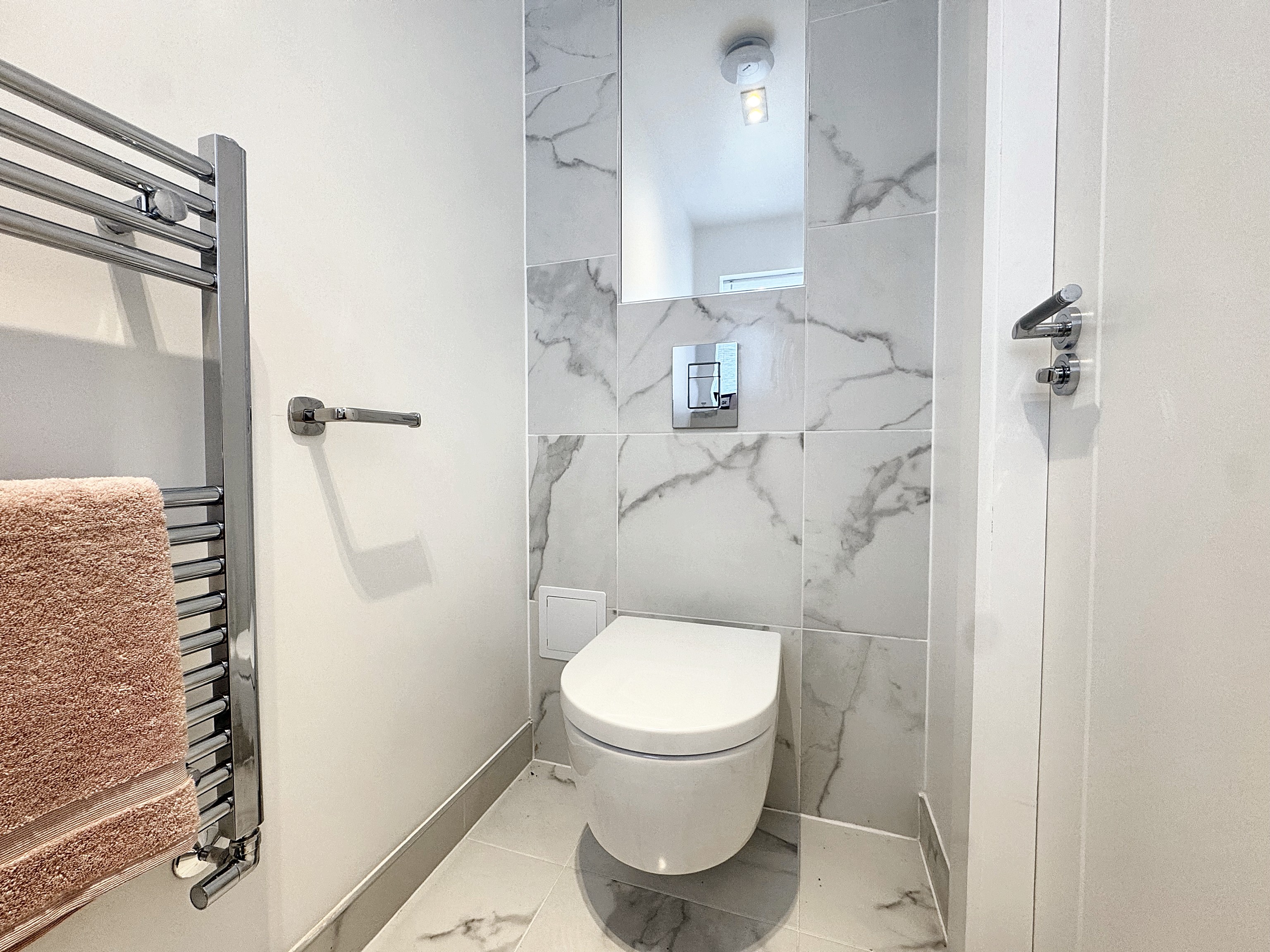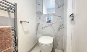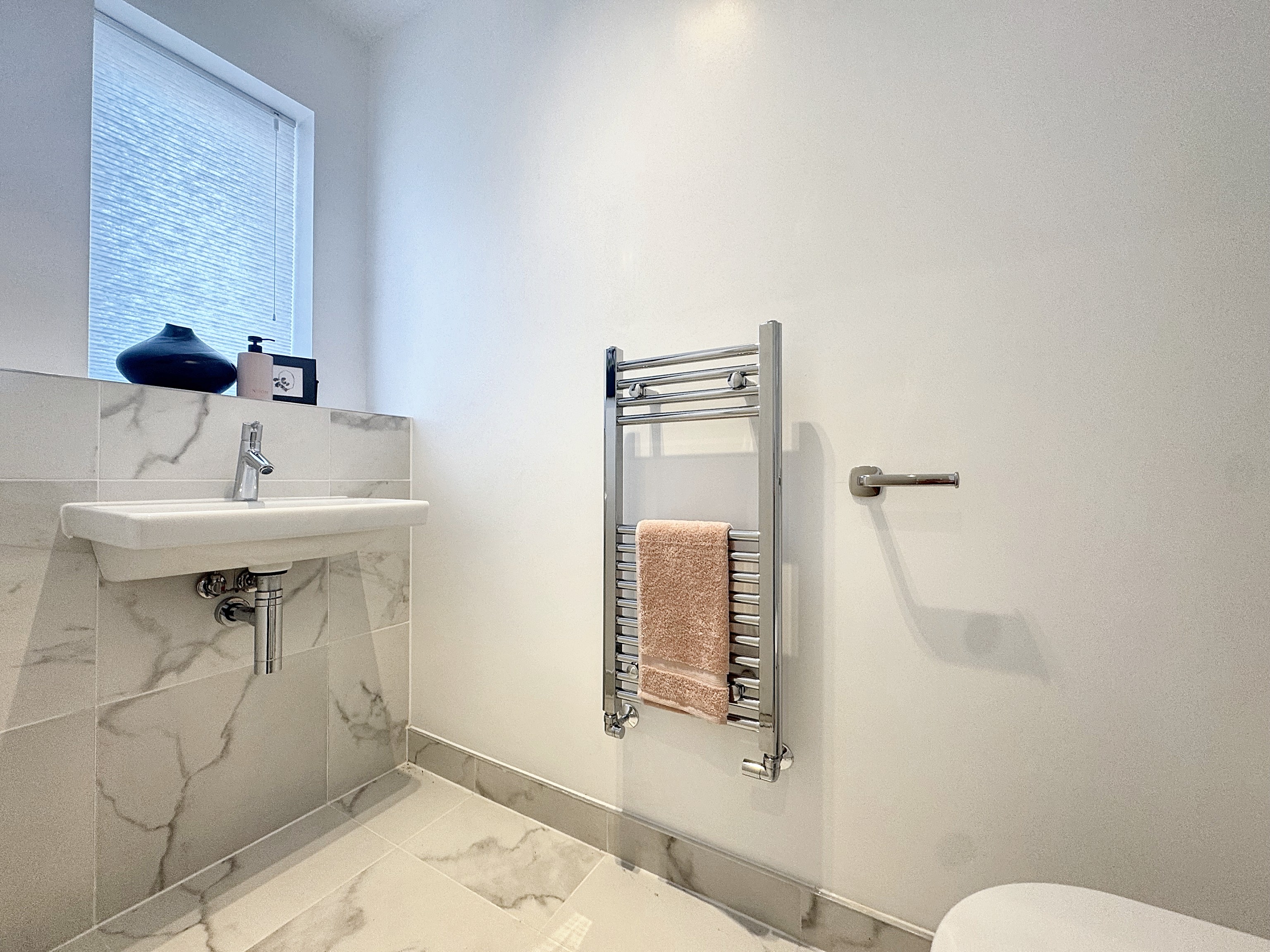 Window to the front elevation. Modern tiled guest W.C and wash basin.