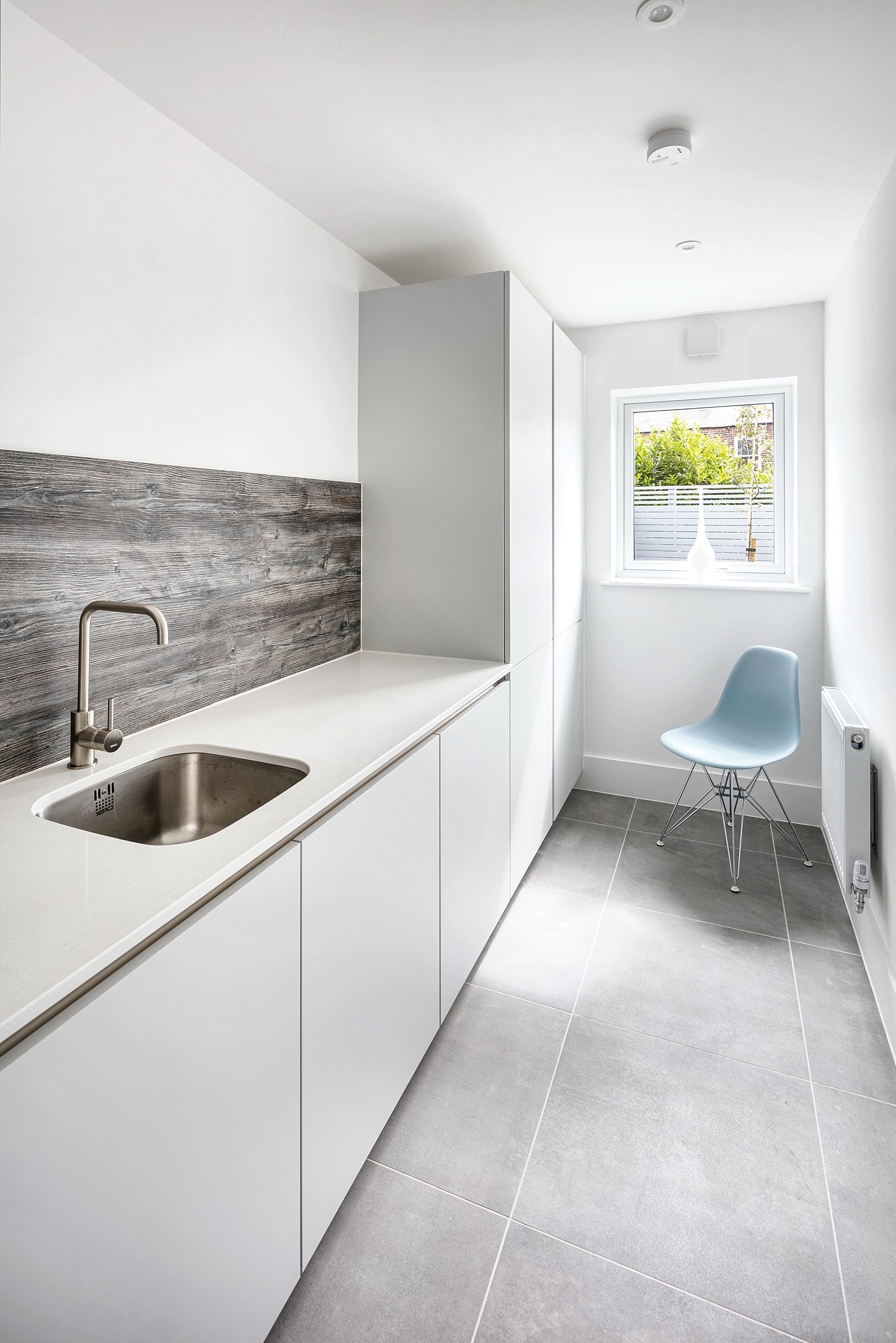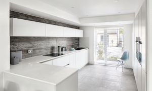Open plan modern kitchen to the living and dining area. A newly fitted kitchen with a range of storage and high quality fittings and appliances, including Neff oven, combi microwave, hob and extractor, larger fridge/freezer, German-made, Schuller units with slim-line stone worktops. Spot lights.