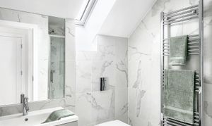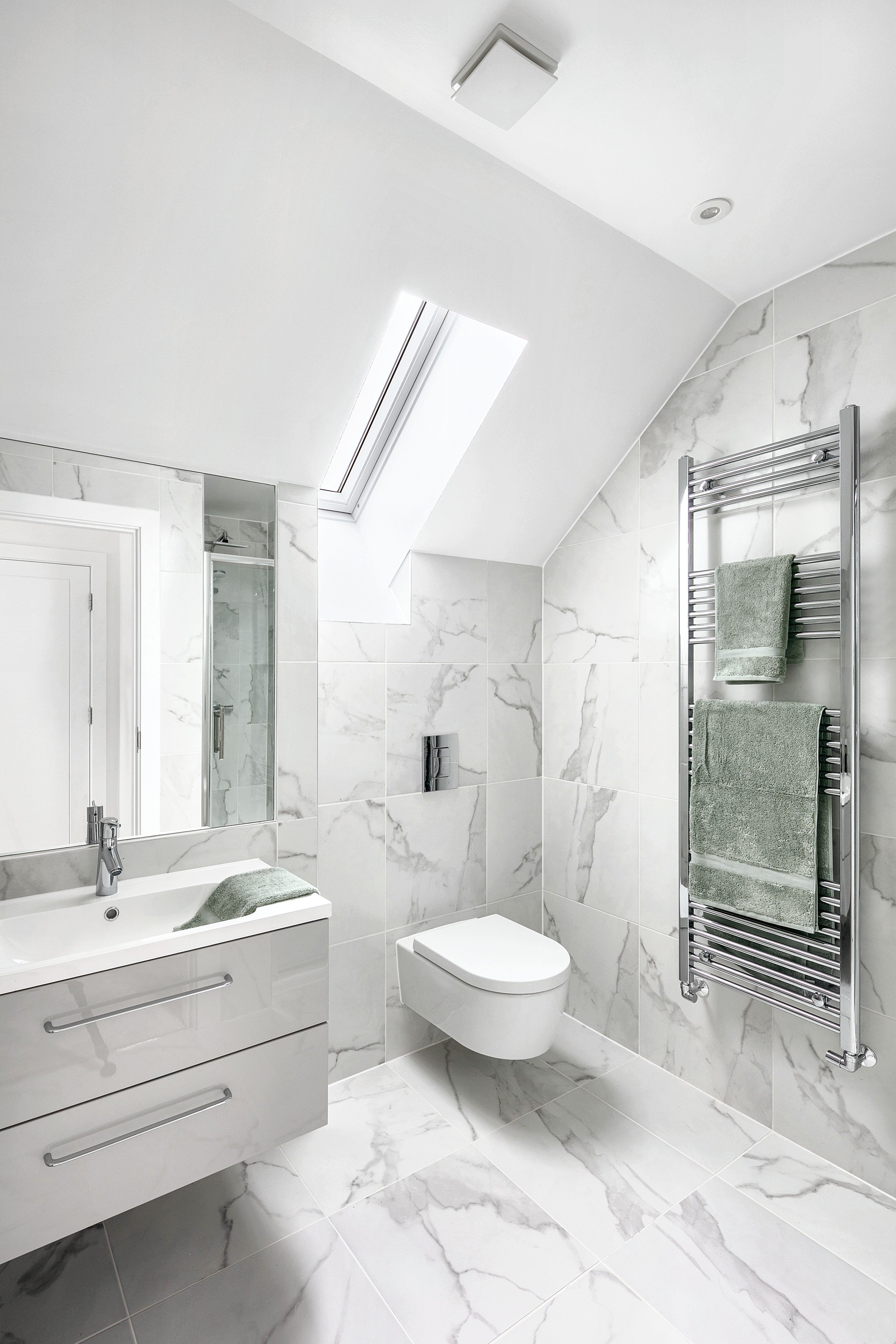 Modern tiled en-suite shower room with velux window with shower cubicle, Villeroy & Boch sanitary ware, contemporary large vanity units with porcelain hand-wash basin. Towel rail. Spot lights.