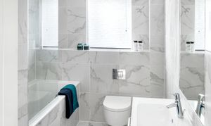Window to the side elevation. Modern tiled bathroom suite with Villeroy & Boch sanitary ware, contemporary large vanity units with porcelain hand-wash basin. Towel rail. Spot lights.