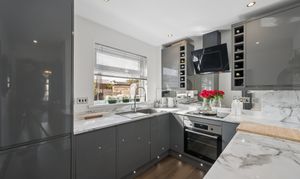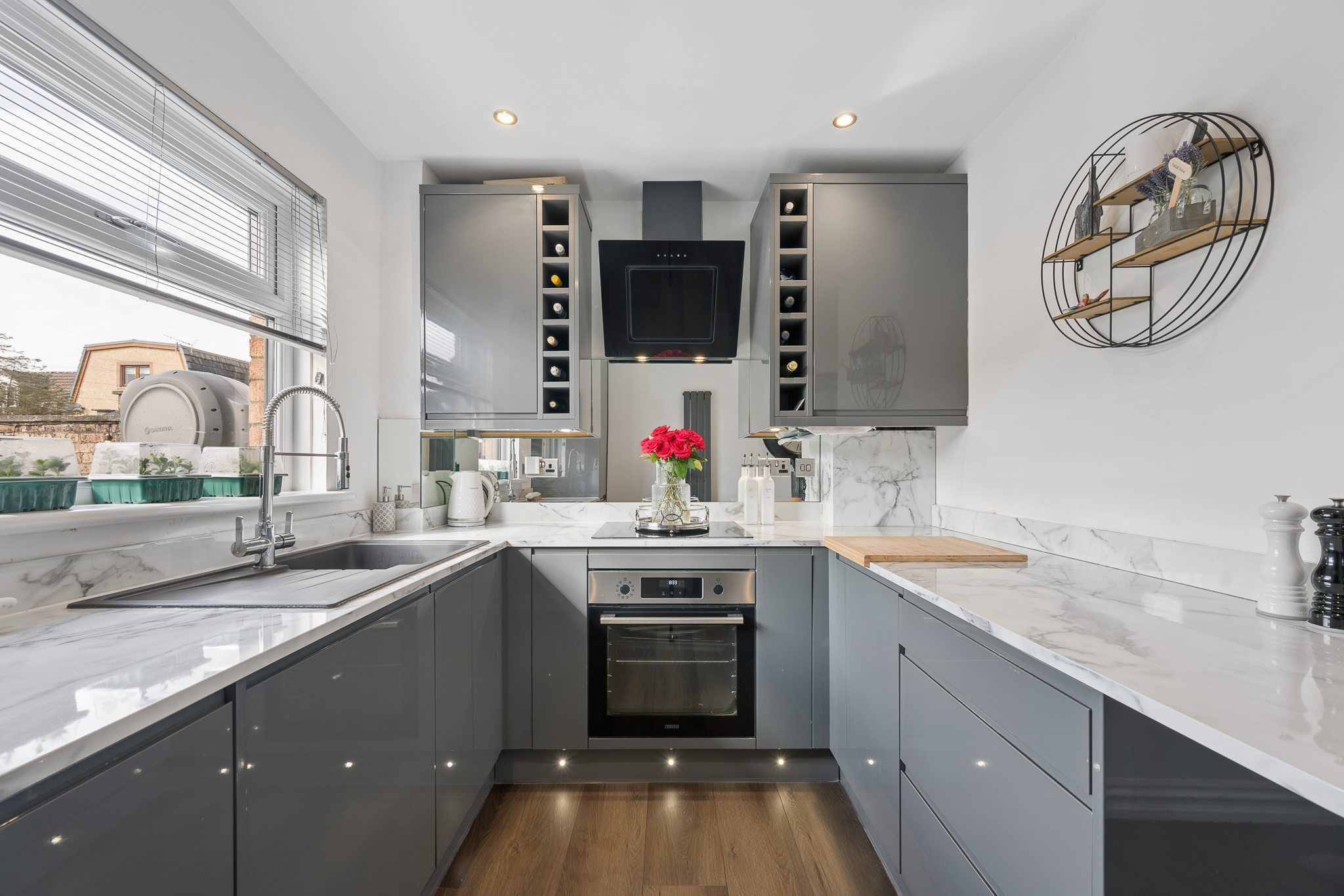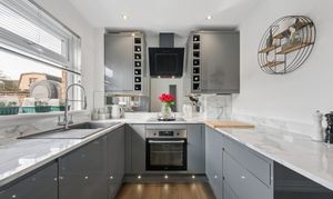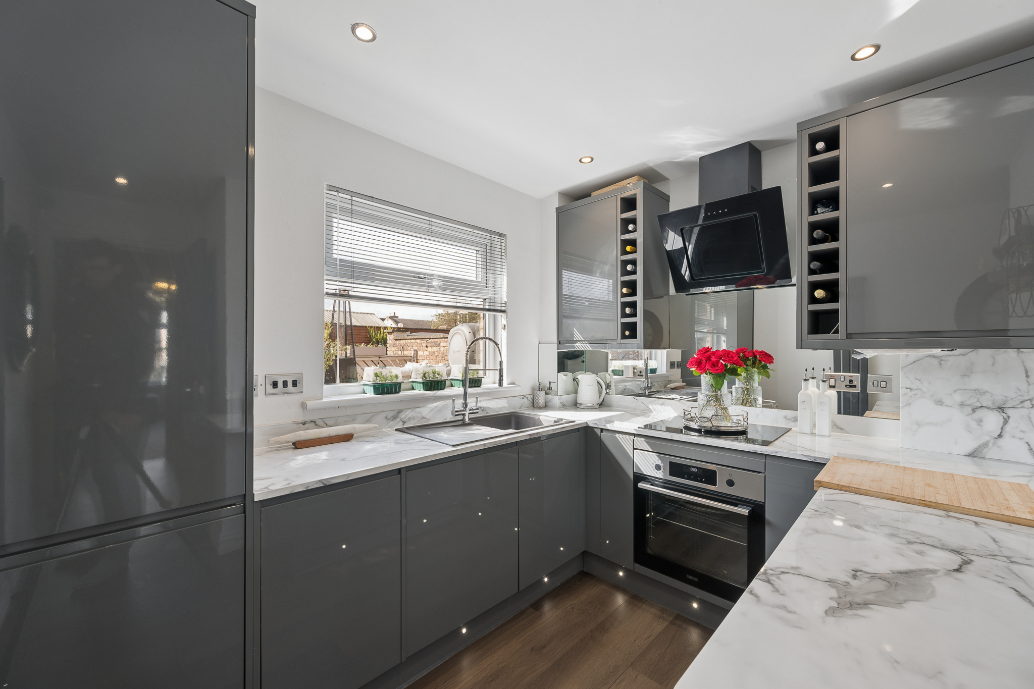 Adjacent to the bathroom lies the stunning kitchen, a true highlight of the home. Finished with high gloss cabinetry and striking worktops, the space is further elevated by a mirrored splashback that enhances both light and depth. The kitchen is fully equipped with integrated appliances including a fridge freezer, washer dryer, dishwasher and oven, offering a seamless and modern finish. A window overlooks the rear garden, bringing in natural light and providing a pleasant outlook while cooking or entertaining.