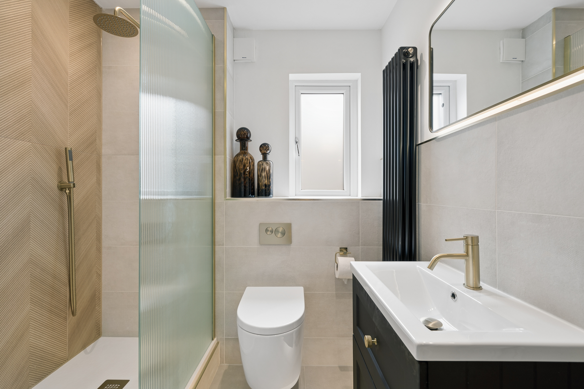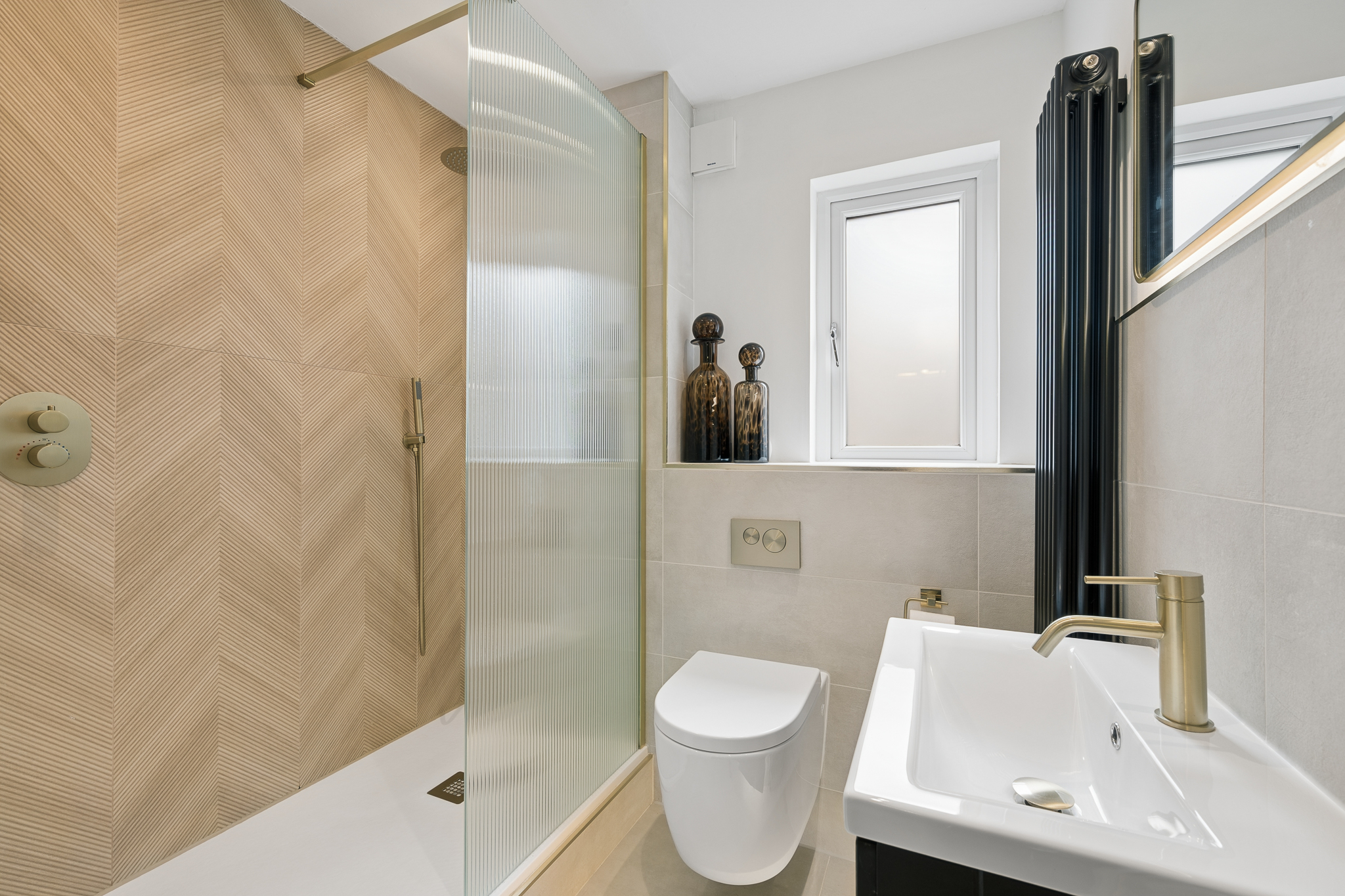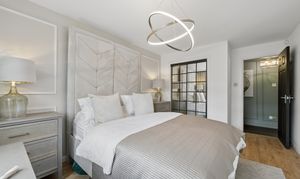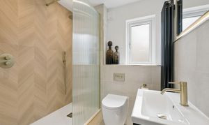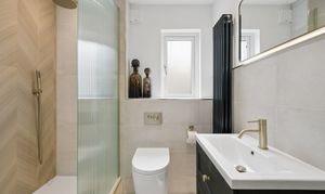 To the right hand side of the hallway, you will find the show-stopping bathroom. Designed with a spa inspired aesthetic, this space has been finished to an exceptional standard. A sleek walk in shower with statement tiling, modern sanitaryware and a contemporary vanity unit are complemented by ambient sensor lighting, creating a luxurious, hotel like feel. Every detail has been carefully considered to deliver both style and practicality.