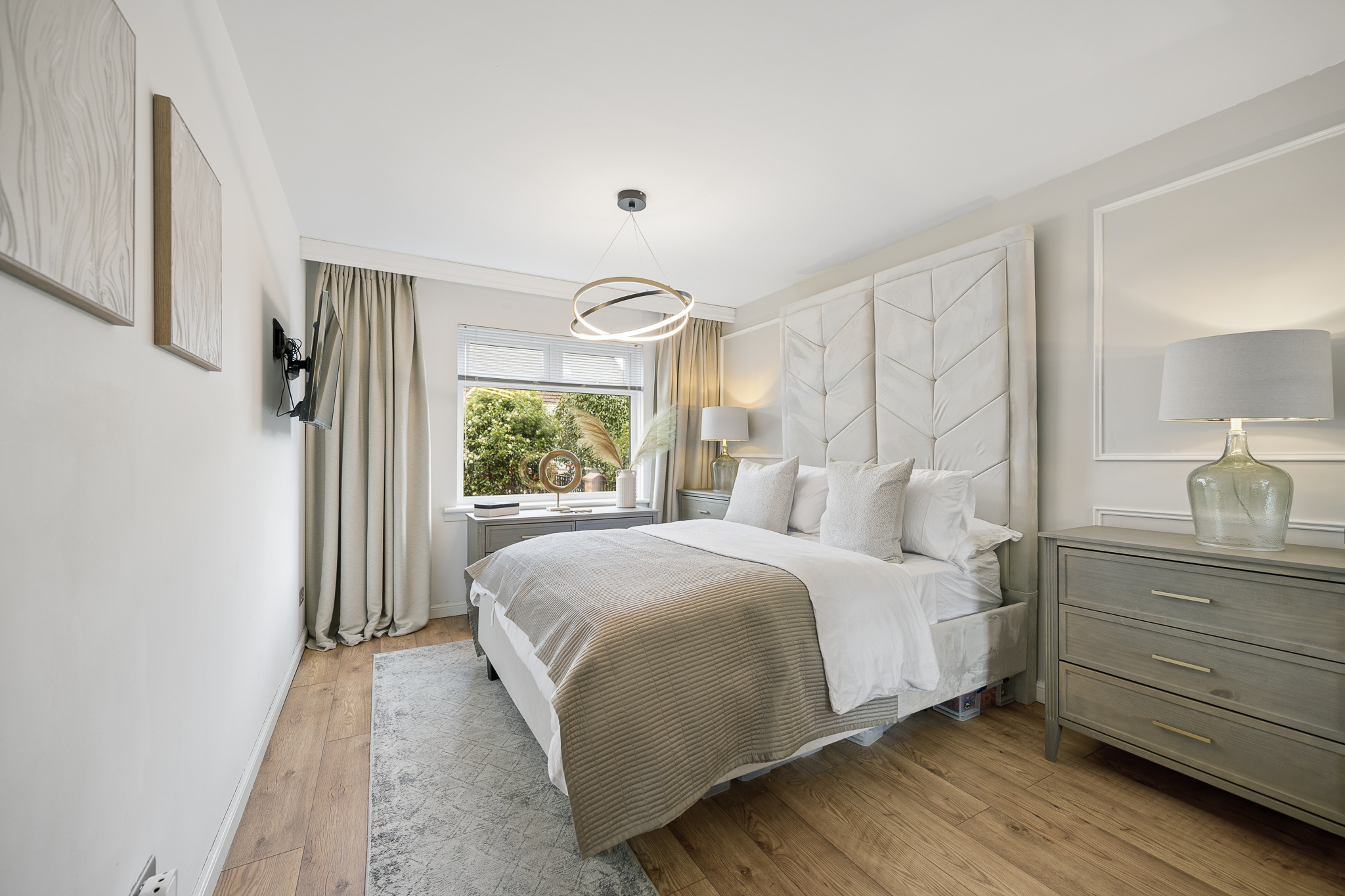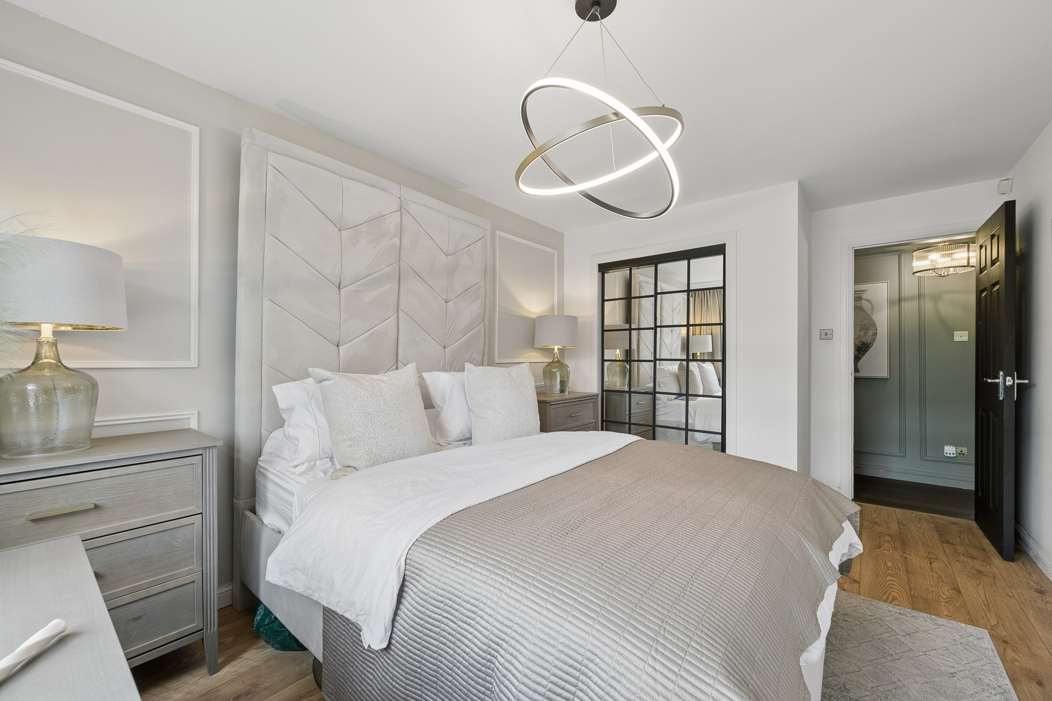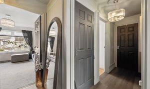 Returning to the hallway, a convenient storage cupboard provides excellent everyday practicality. Moving further through the property, to the front on the left hand side, you will find the impressive principal bedroom. This is a beautifully styled space, finished in calming neutral tones and featuring built in mirrored wardrobes that not only offer excellent storage but also enhance the sense of space and light within the room.