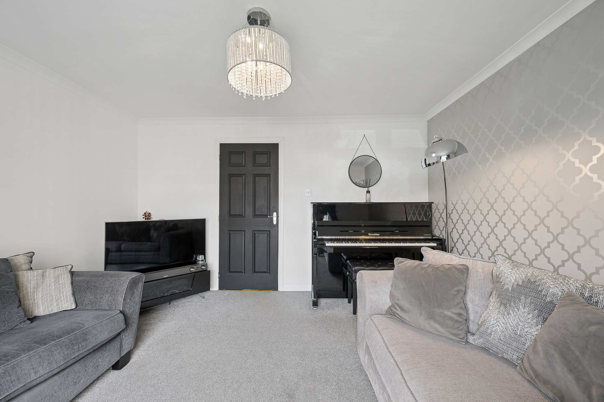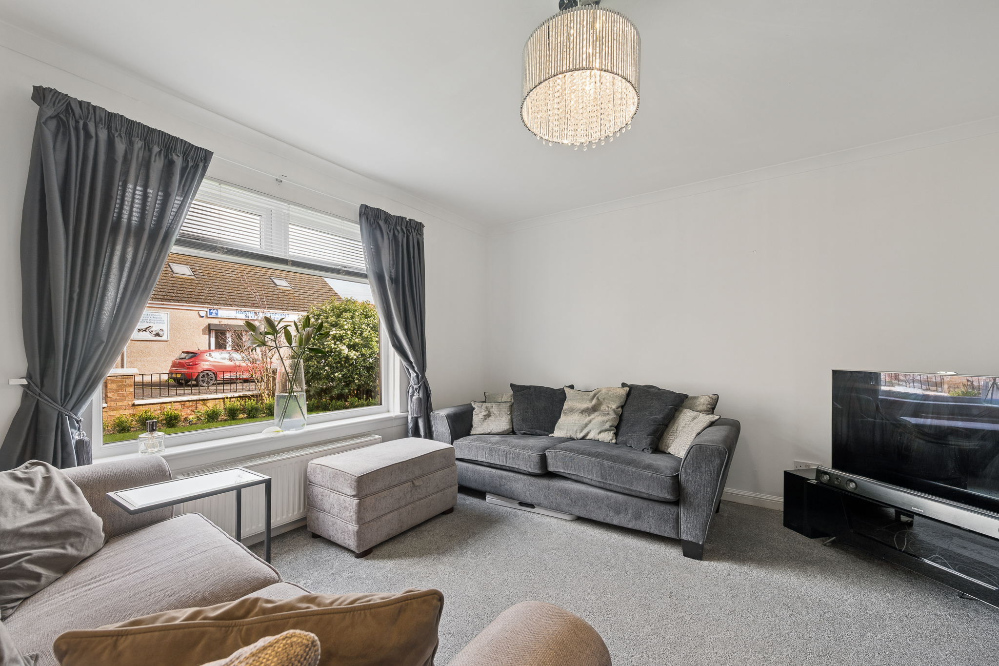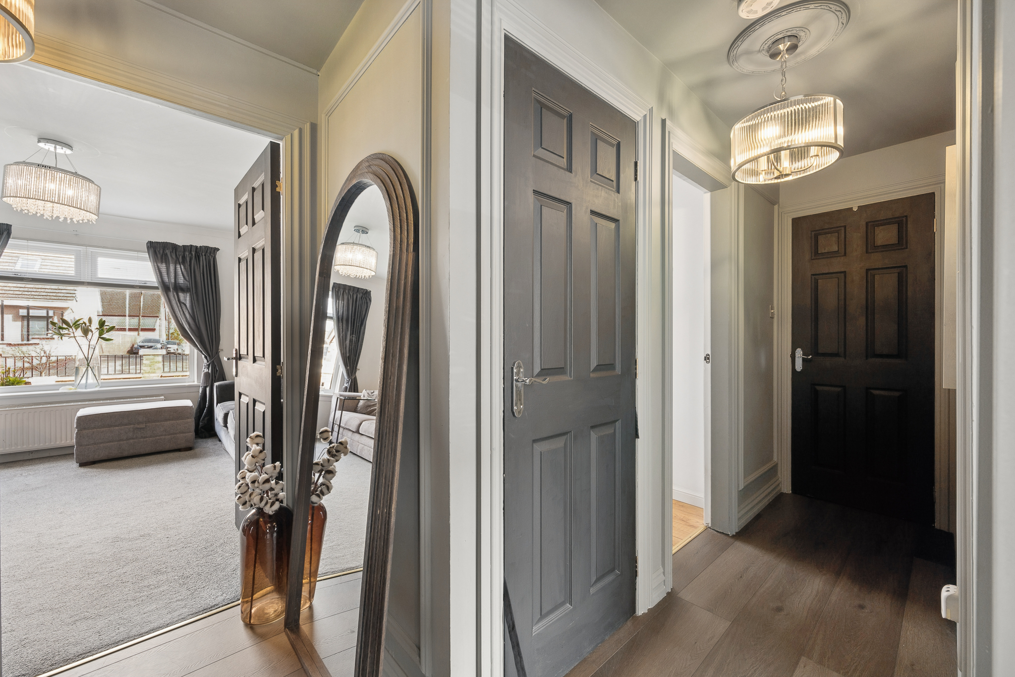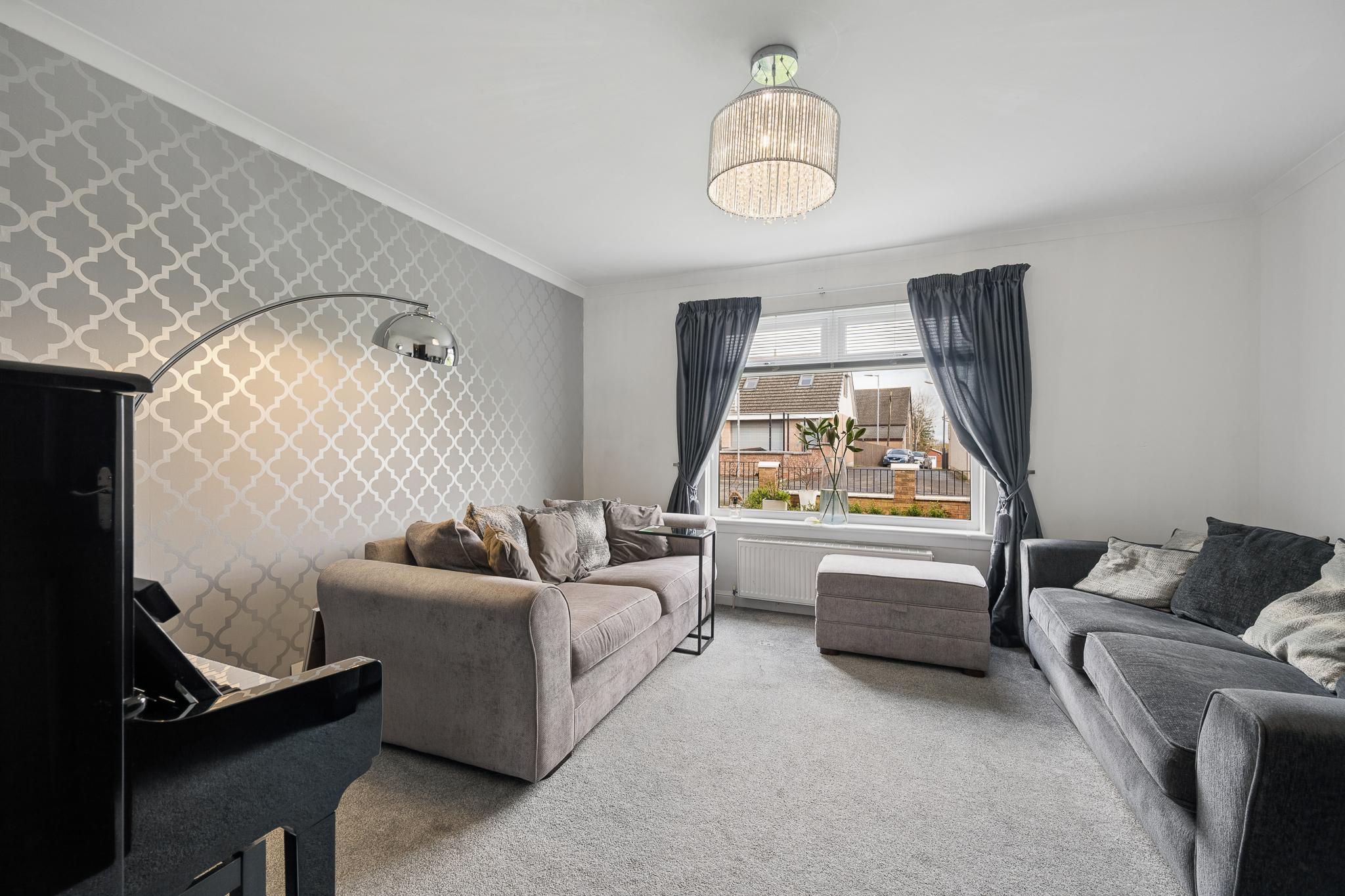 Upon entry, you are welcomed into a bright and inviting hallway, finished in warm, contemporary tones with elegant wall detailing and sleek flooring underfoot. Directly ahead, you are drawn into the main living area, a beautifully styled lounge that feels both cosy and sophisticated. A large window floods the room with natural light, enhancing the soft neutral palette and plush carpeting. The feature wallpaper adds subtle character, while the layout comfortably accommodates multiple seating areas, creating the perfect space to relax or entertain.