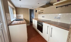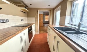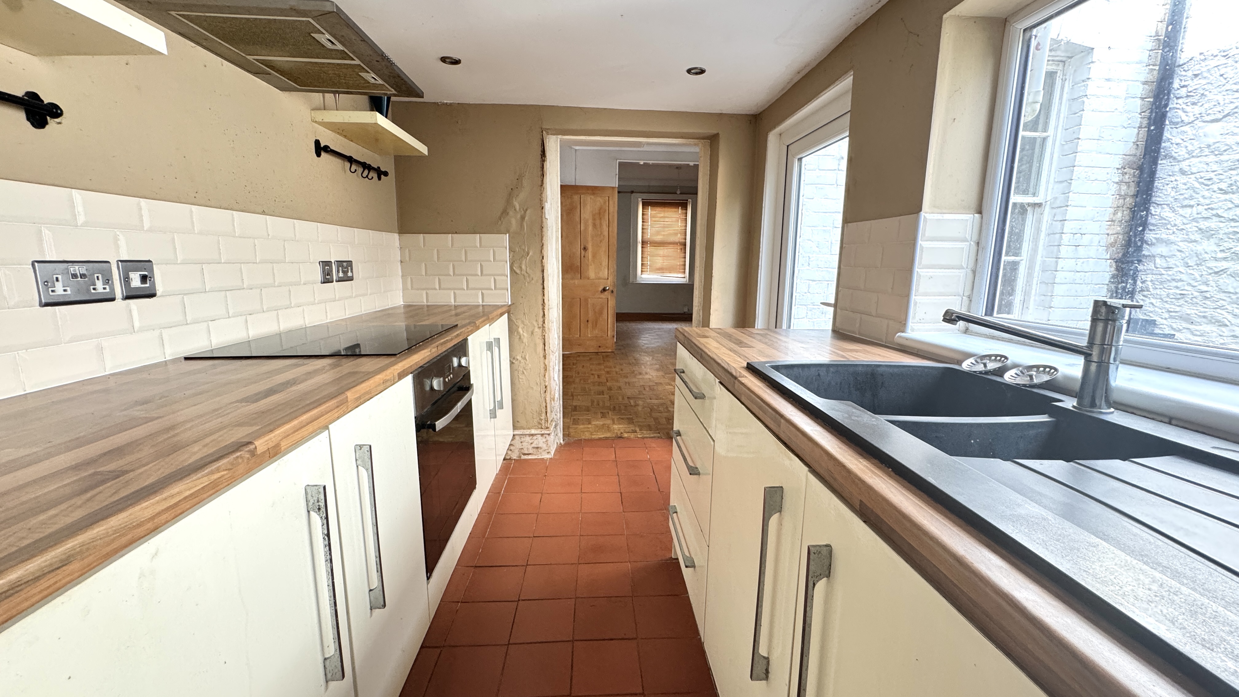 The fully fitted kitchen is equipped with cream base units complemented by contrasting wood-effect worktops, and from here there is direct access to a small courtyard at the rear, providing a private and low-maintenance outdoor area.