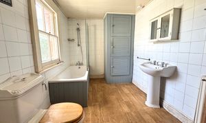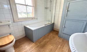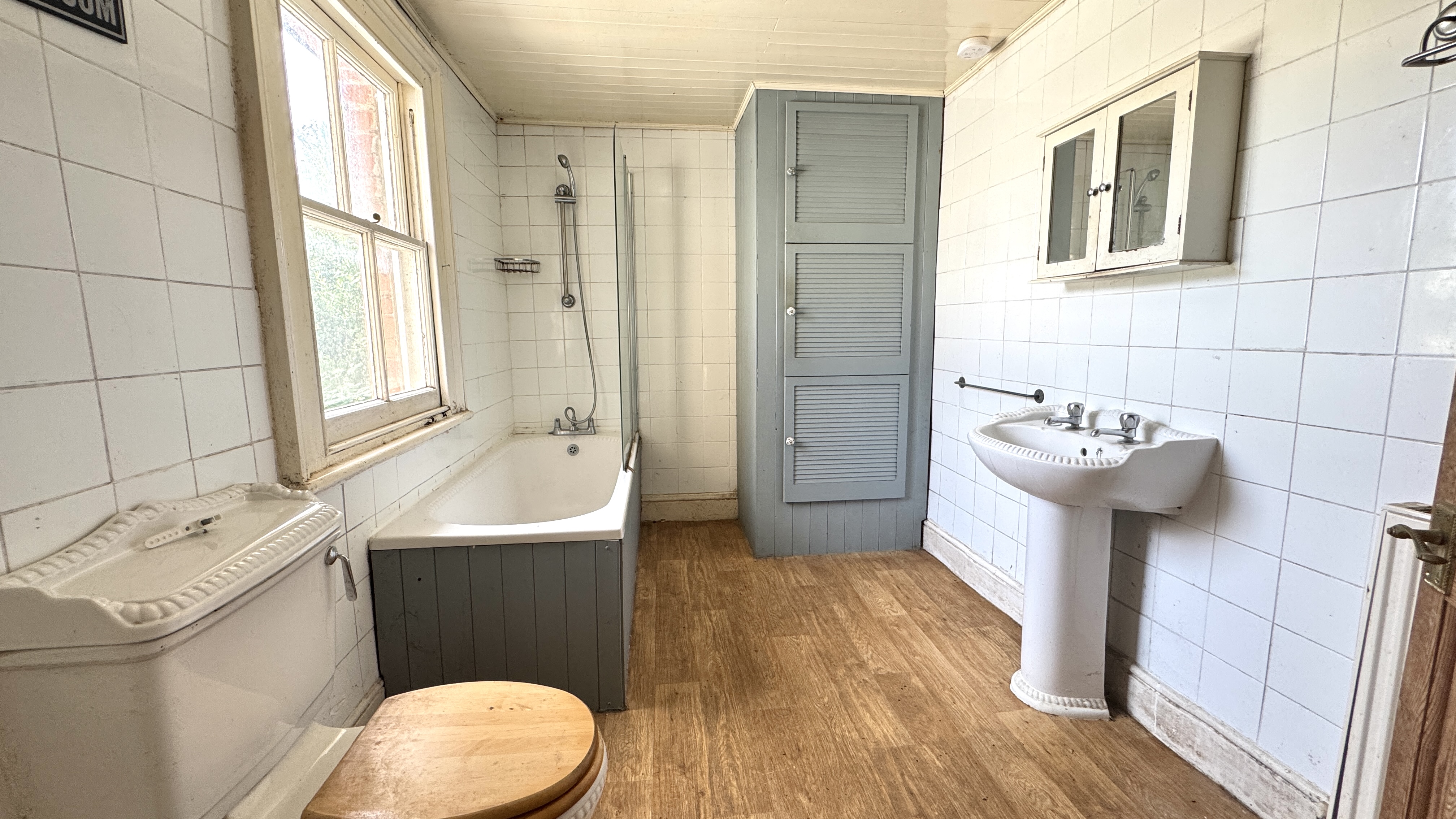 From the hallway, stairs lead to the first floor where you will find a particularly generous bathroom complete with a built-in airing cupboard, a full-size bath with shower over, a low-level WC and a wash hand basin.
