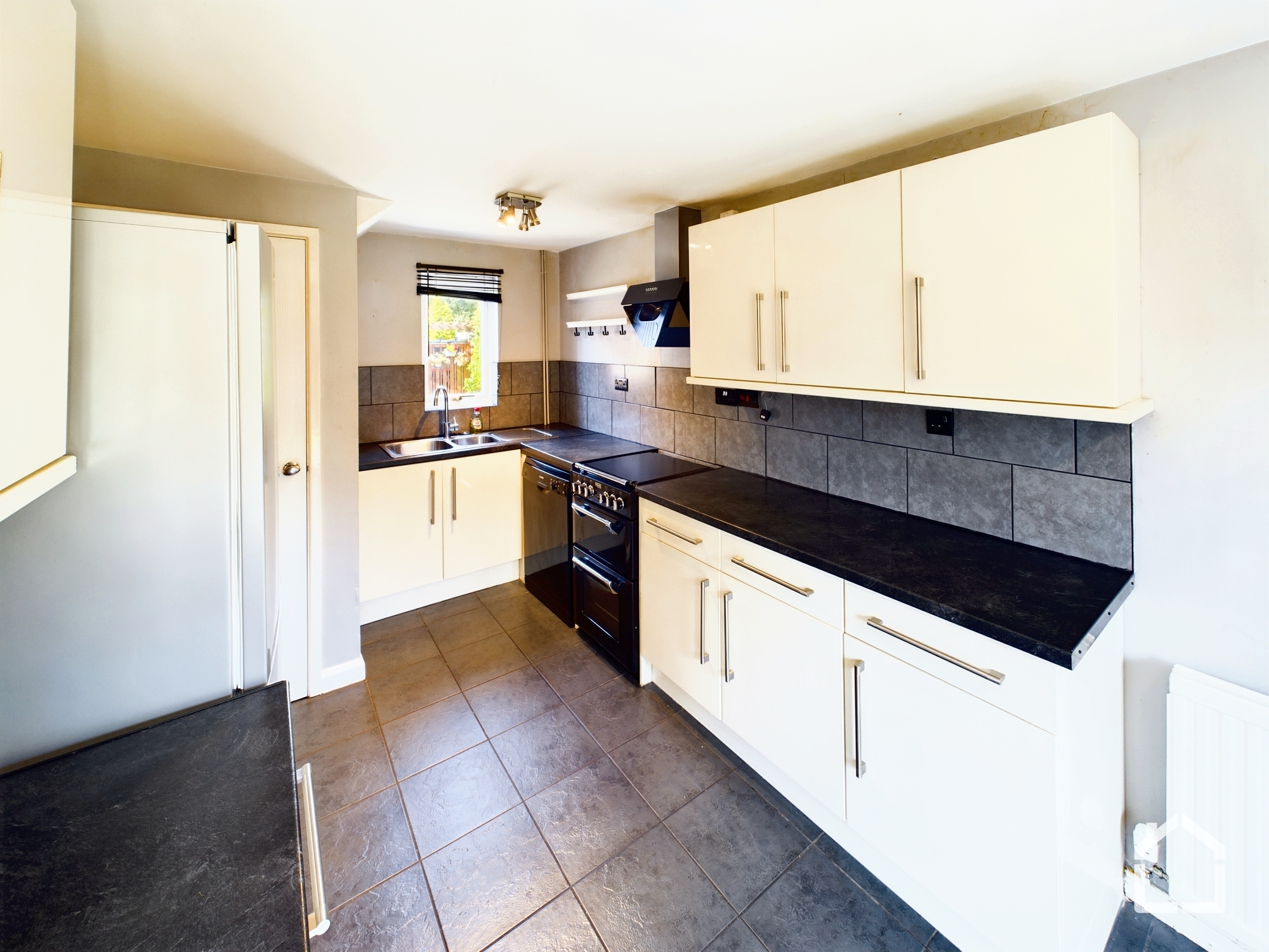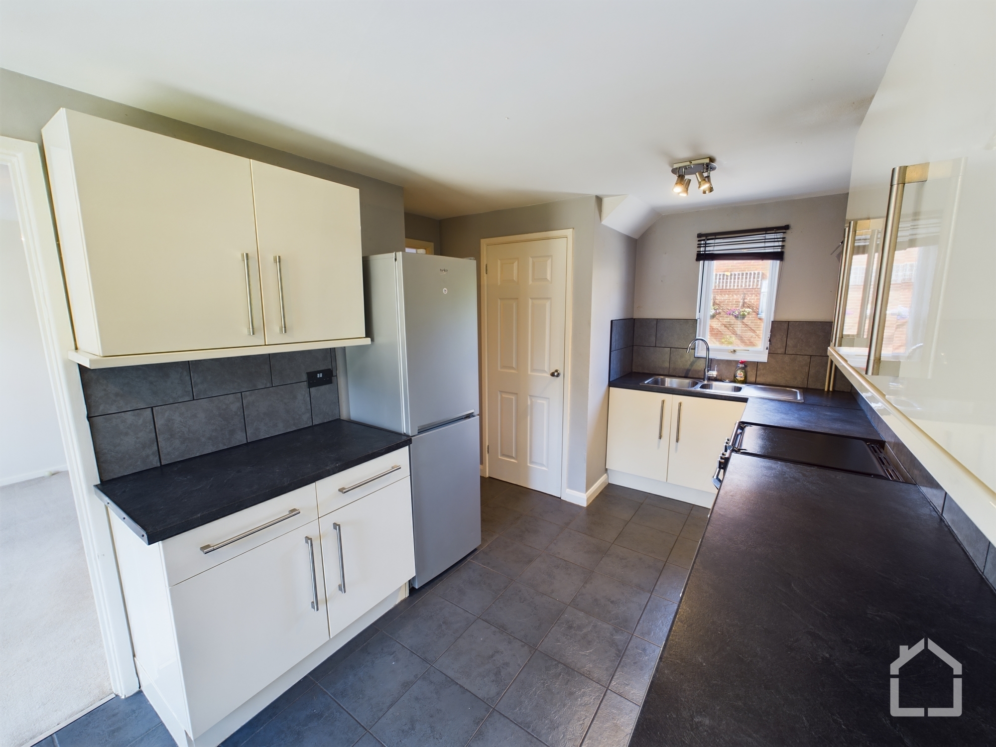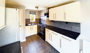 This two-bedroom semi-detached house offers a well-arranged ground-floor layout comprising a separate living room and fitted kitchen, accessed via a central hallway. The living room provides defined space for seating and furnishings, while the kitchen includes a range of base and wall units, worktop space, and room for appliances, with direct access to the rear garden and patio area.
