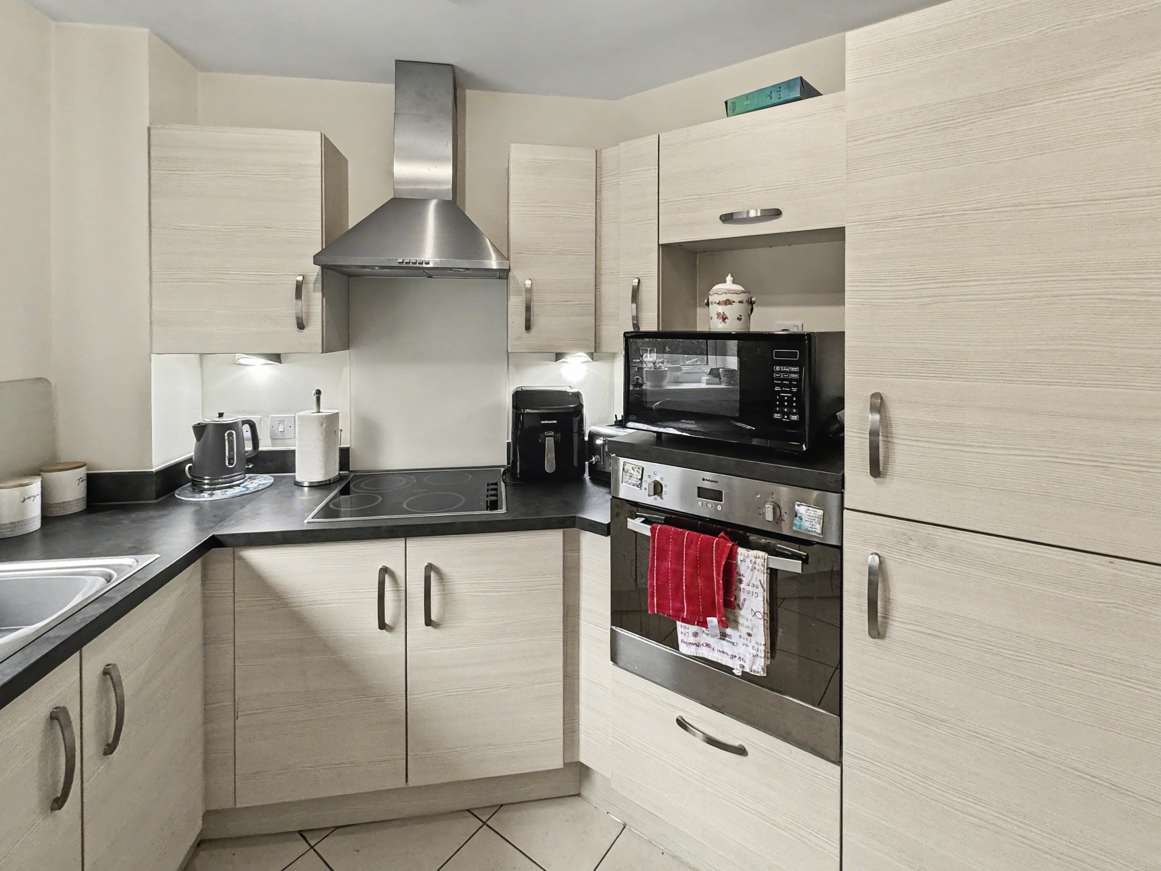 The apartment itself is thoughtfully laid out, featuring a bright and welcoming lounge with ample space for both seating and dining, which opens onto a private balcony — perfect for unwinding with a good book or simply enjoying the tranquil surroundings. The modern kitchen is well appointed, offering practical worktop space and ample storage.