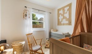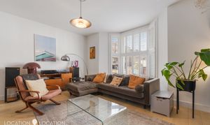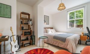 At over 1,200 sq. ft. there’s space to grow into. There is a spacious principal bedroom with a sleek en-suite shower room, plus two guest bedrooms, one with room for storage, and the other making for a perfect nursery or home office. The shared bathroom suite is stylishly designed, and the raised ground floor’s reception room is flooded with light from the large bay windows, and offers ample room to dine and entertain. An integrated kitchen overlooks the large rear garden, completing the living space.