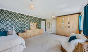 The primary bedroom is located in a peaceful area at the back of the house, overlooking the garden through a broad window. Decorated in a calming palette and a cream carpet illuminated by twin chandeliers, it’s wonderfully inviting and has a walk-in wardrobe. It also features a fully tiled, spot-lit en-suite, complete with a double-ended bathtub (with traditional taps and a handheld shower attachment), a double vanity basin unit, a toilet, and a heated towel rail.