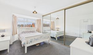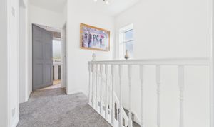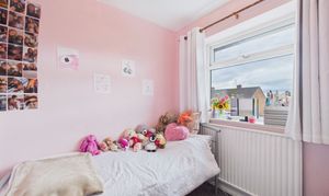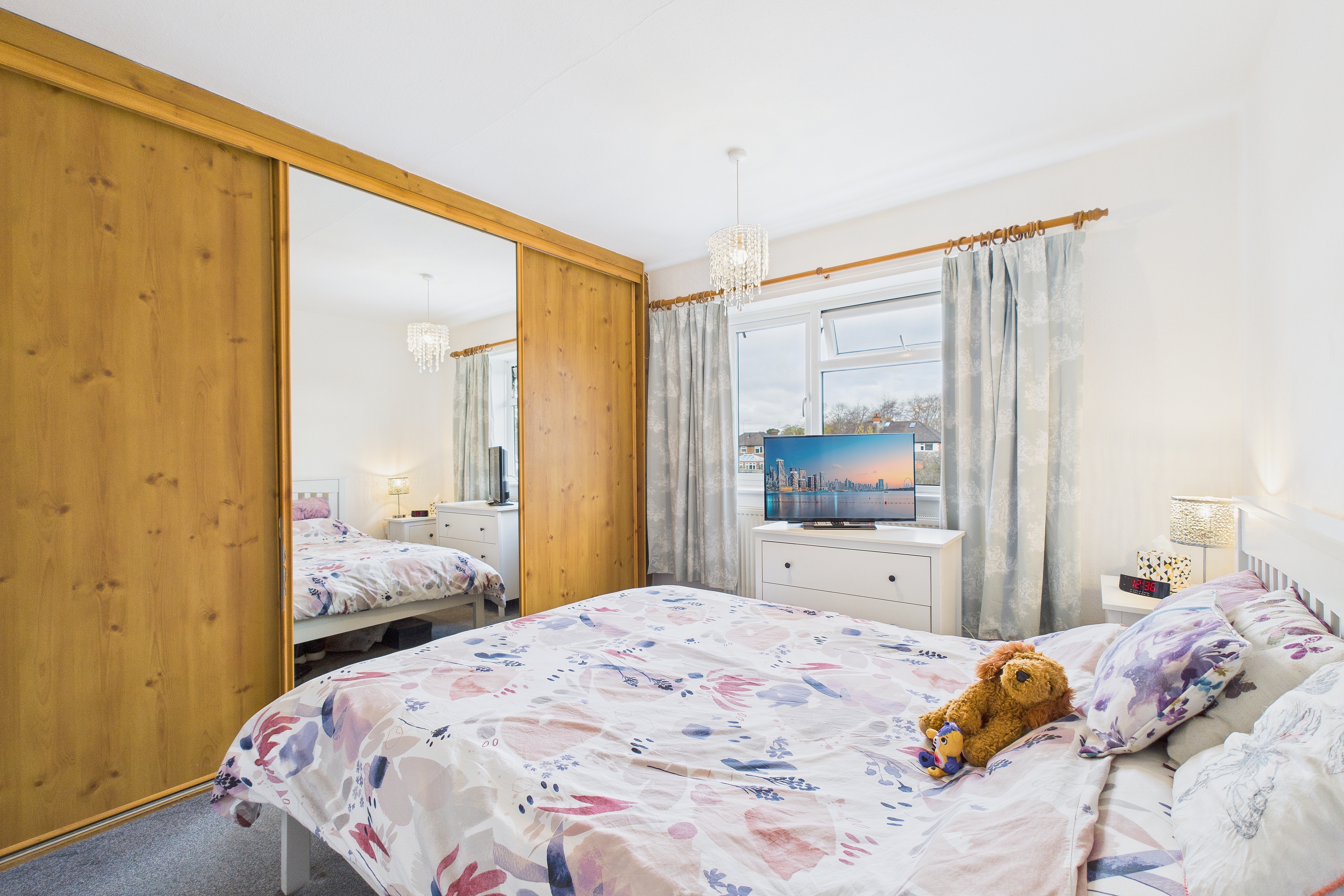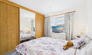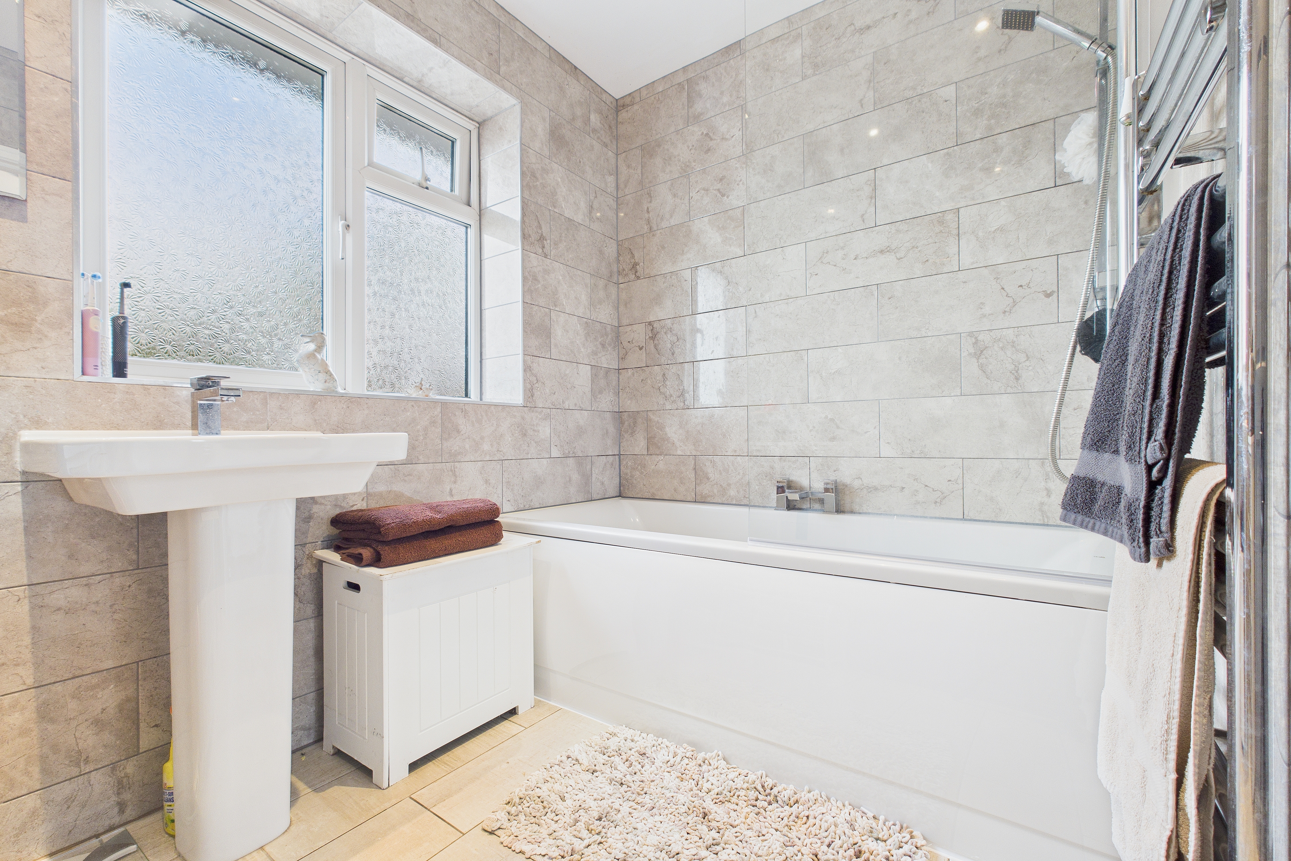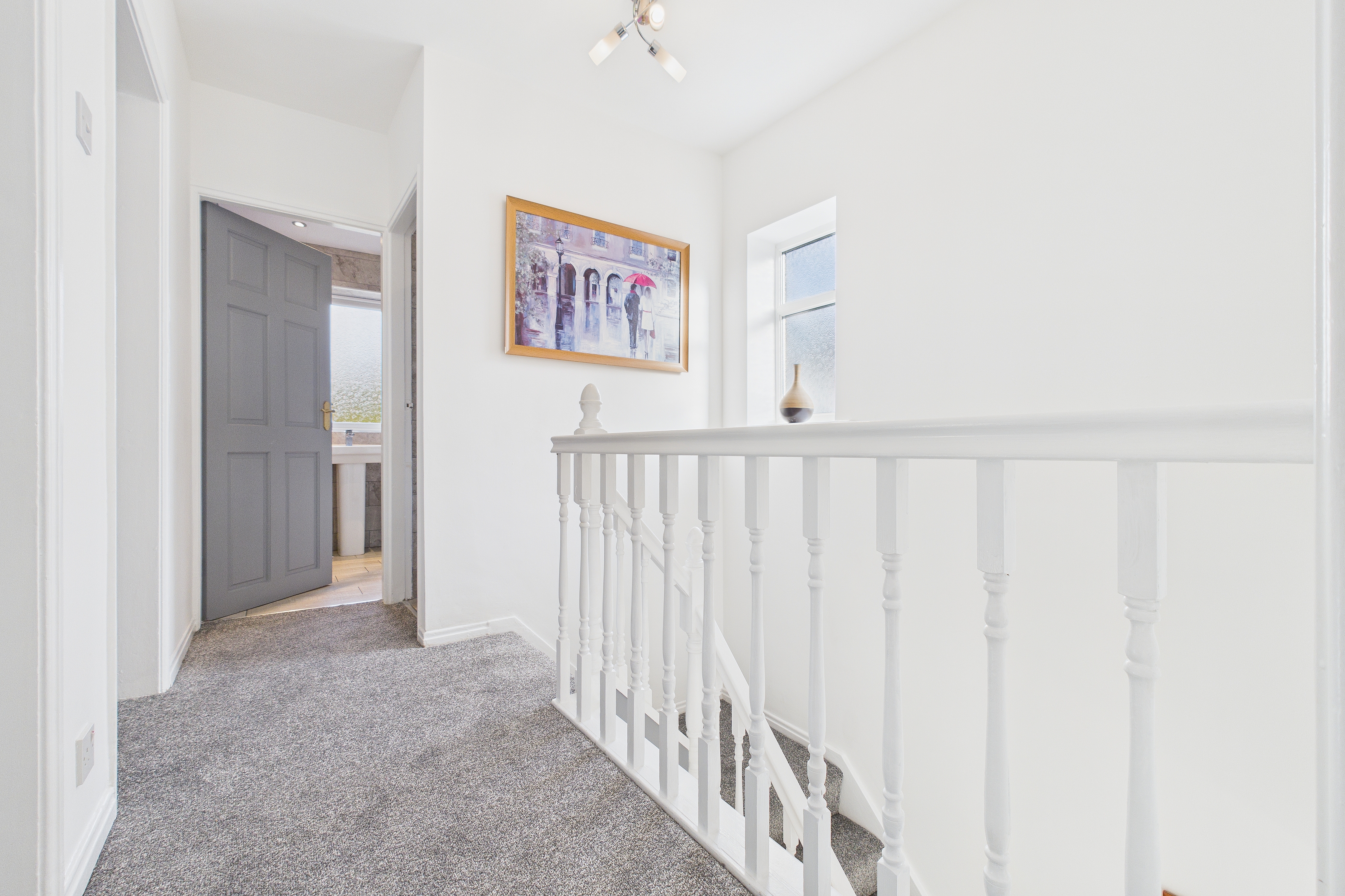 To the first-floor landing, with its spindle balustrade, access is provided to all three bedrooms. Both double bedrooms benefit from built-in wardrobes, with the second bedroom’s storage also housing the gas combination boiler. The third bedroom is ideal as a single room or a comfortable home office for those requiring workspace.
