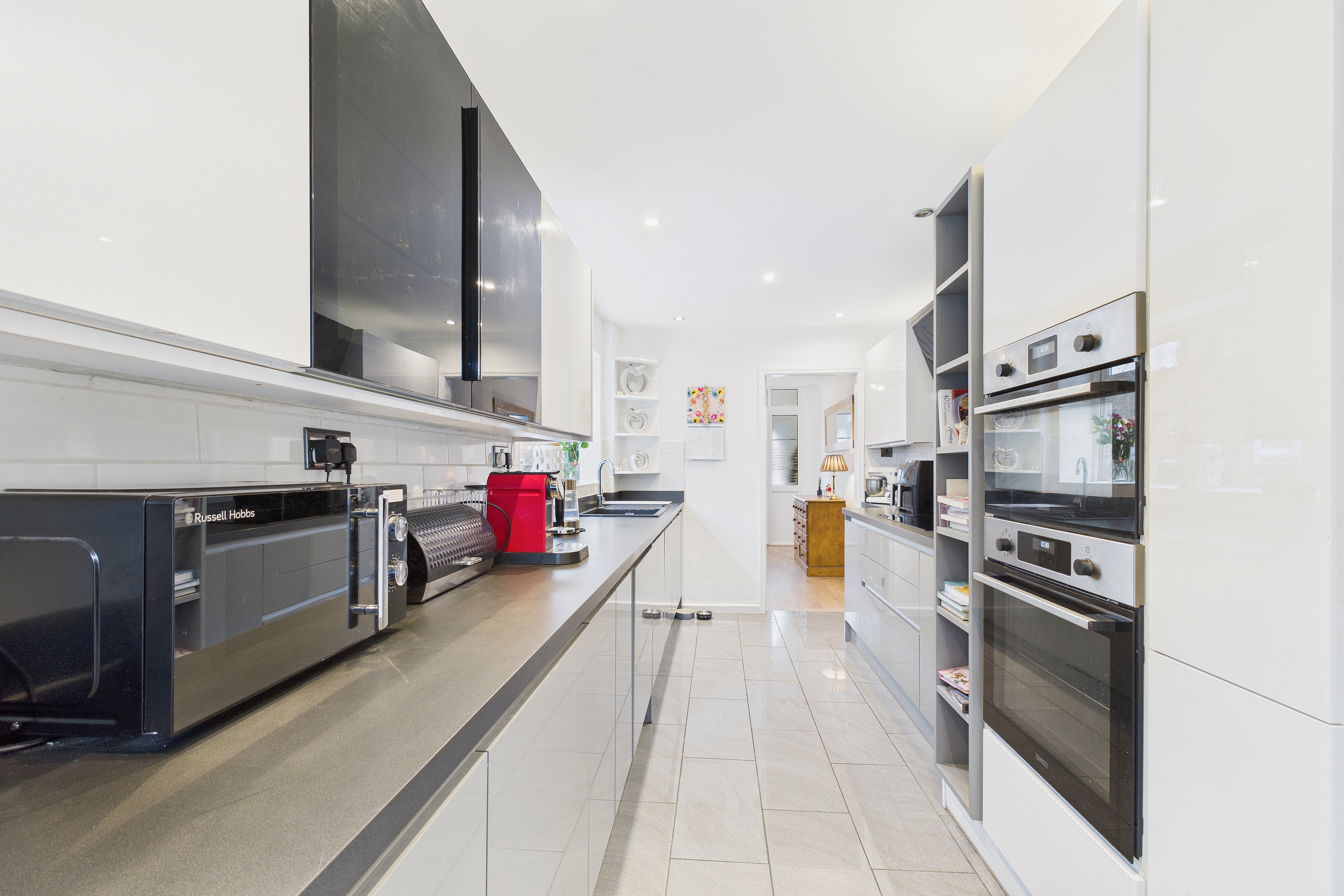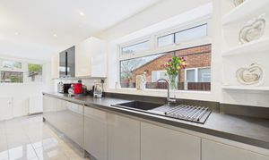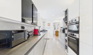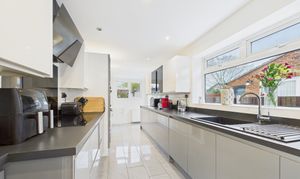 The kitchen is a standout feature of the property, offering an extensive range of sleek, modern handleless units complemented by contemporary work surfaces and integrated appliances.