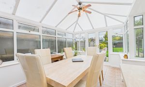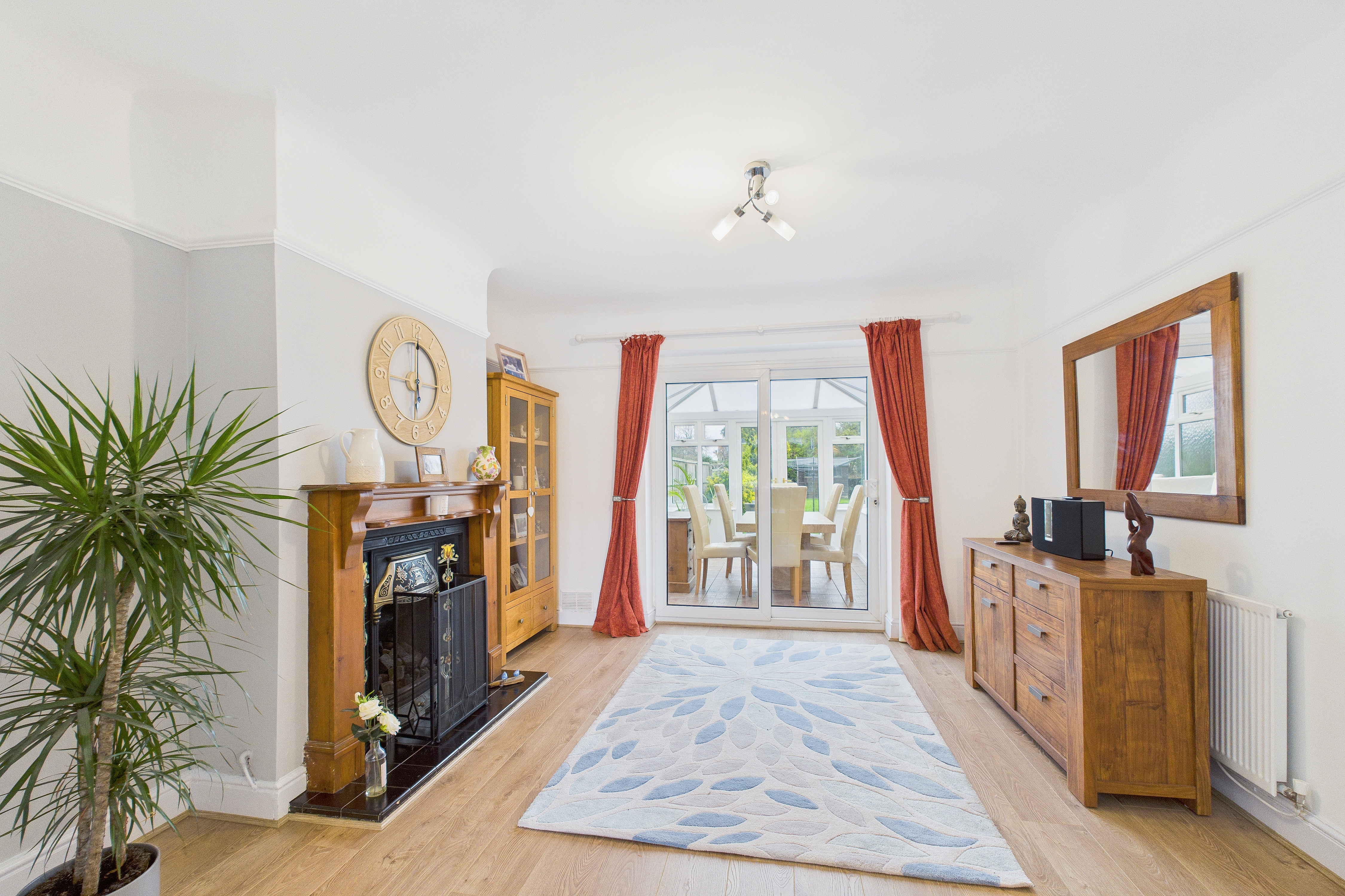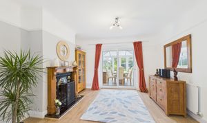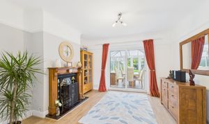 To the rear, a sizeable conservatory extension creates three distinct yet flowing reception spaces. The front-facing living room features a bay window and an attractive fireplace with polished hearth and cast-iron log burner. This leads into the dining room, which enjoys its own tiled fireplace and wooden mantle, and in turn opens through sliding double-glazed doors into the conservatory—a versatile room with tiled flooring, heating, and French doors linking effortlessly to the garden.