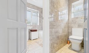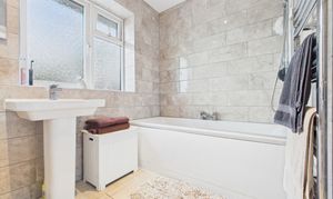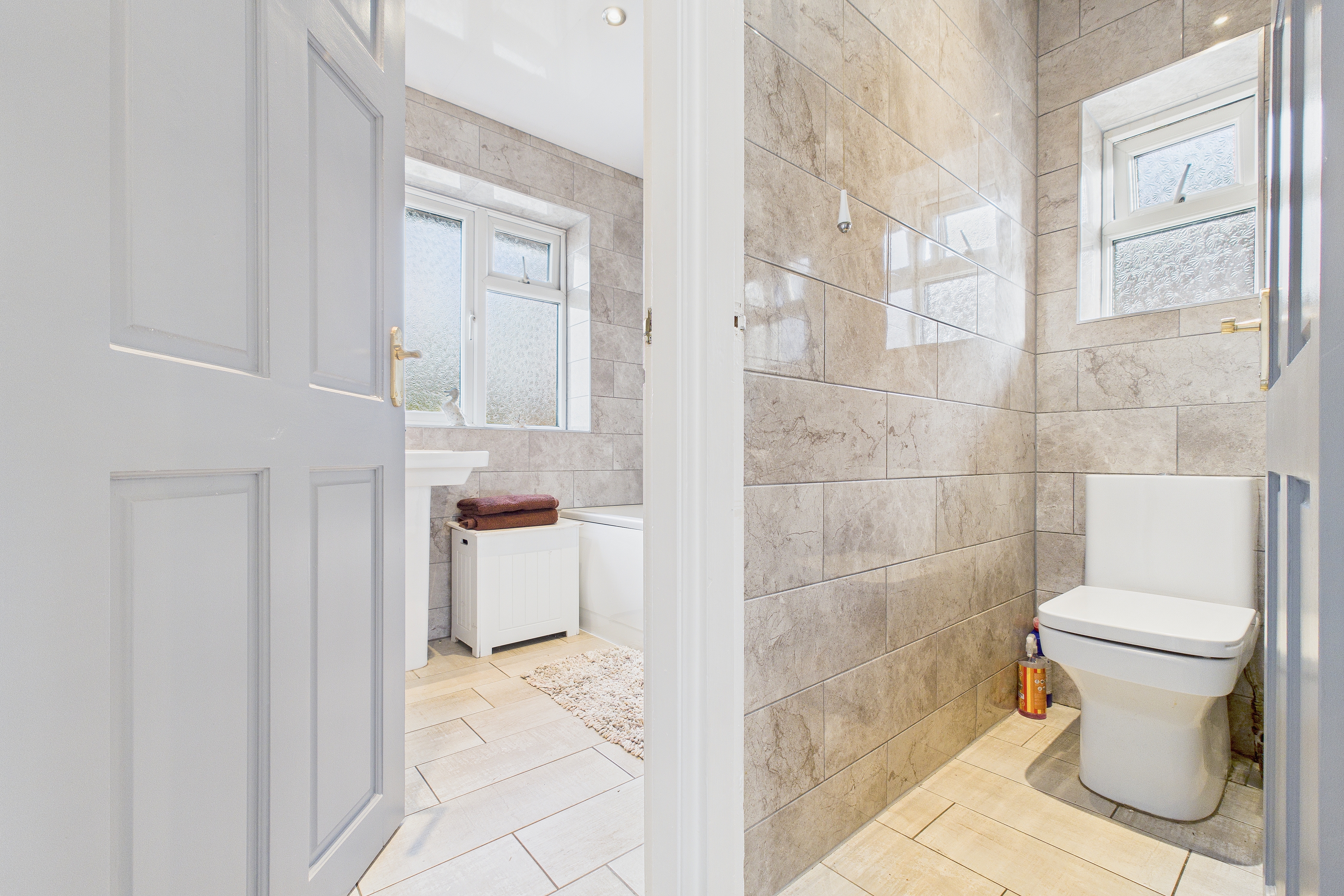 The bathroom is fully tiled and fitted with a modern suite, including a dual-head mixer shower over the bath and a pedestal wash basin. A separate WC is accessed from the landing for added convenience.