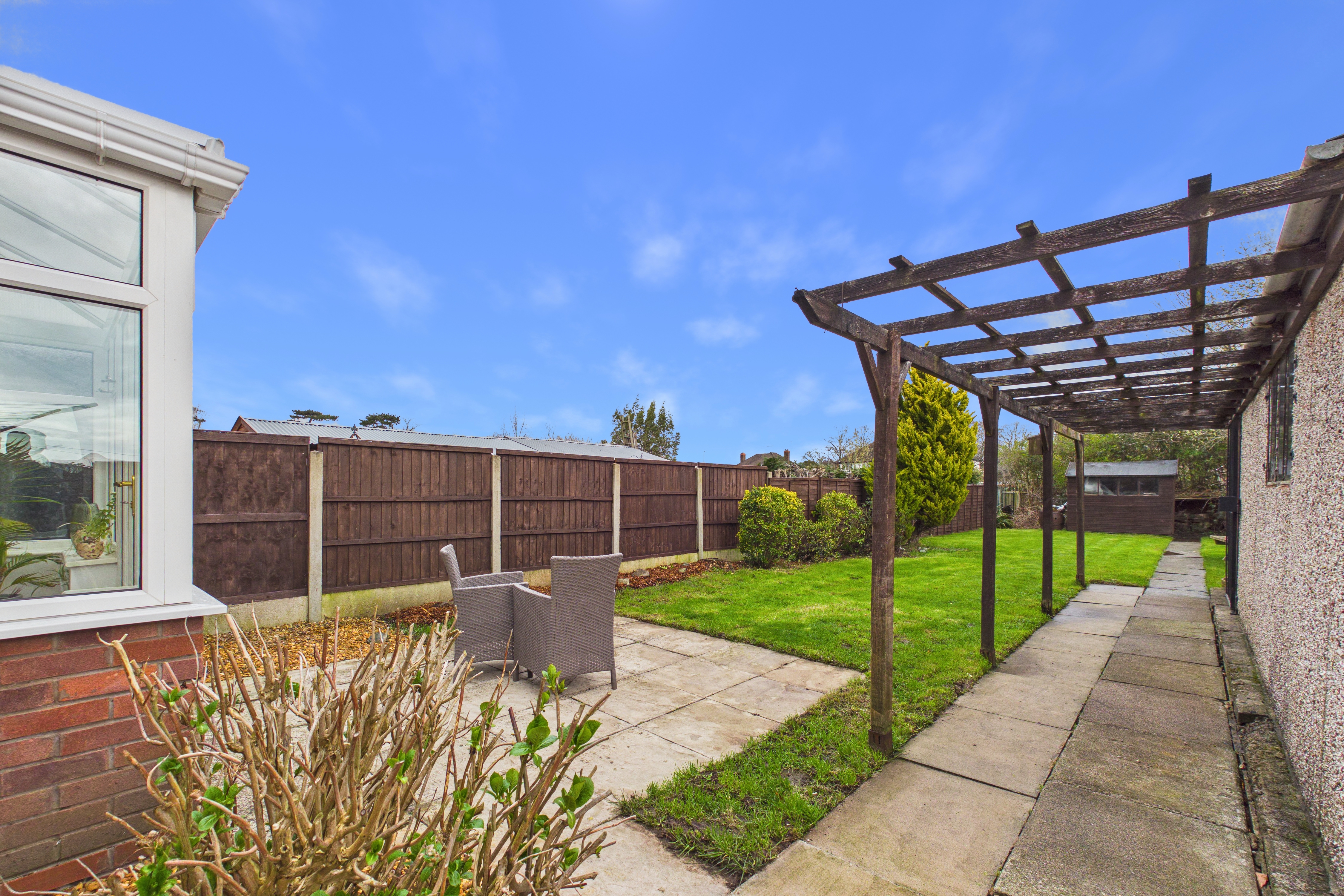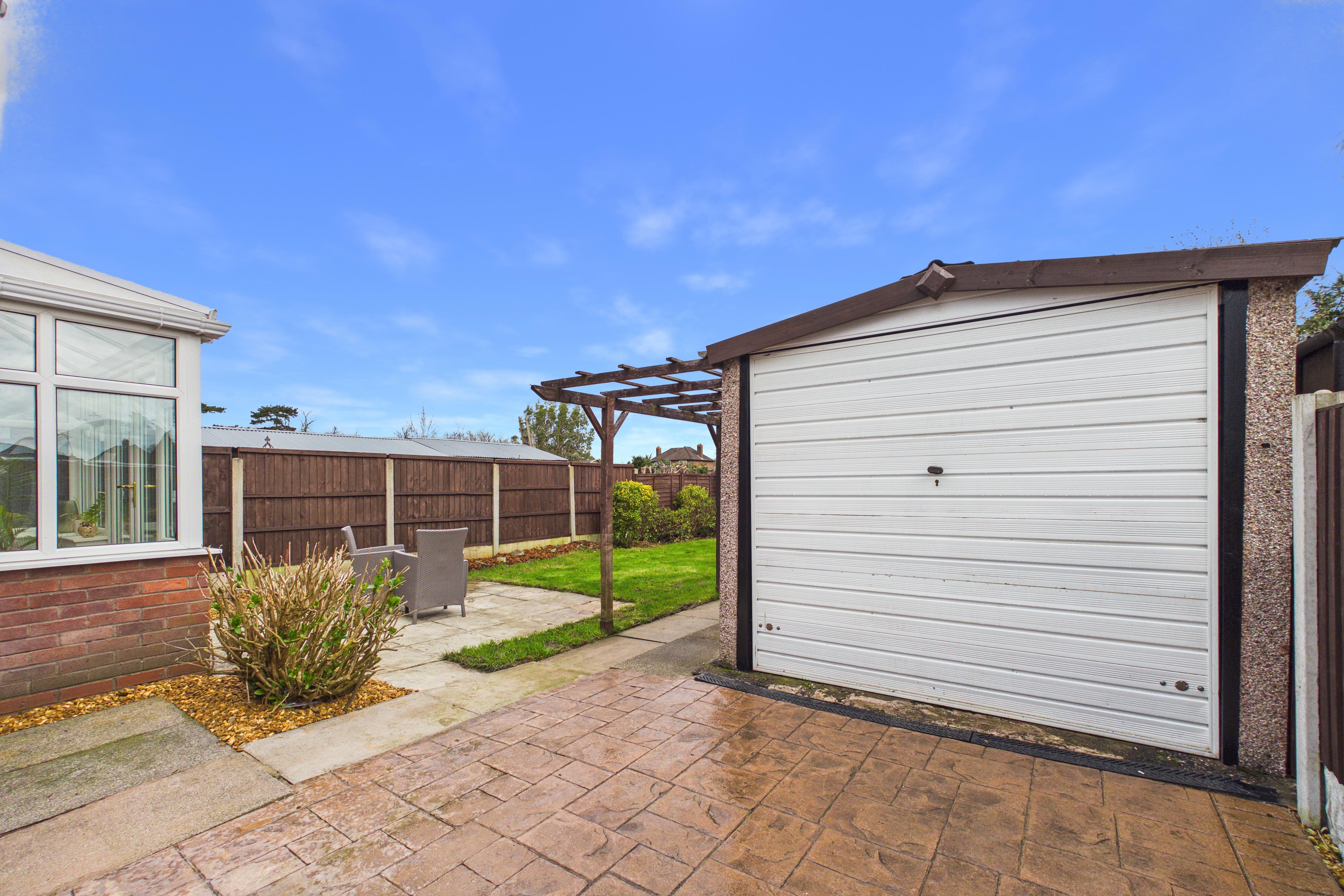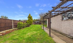 The property is approached via a private patterned concrete driveway providing off-road parking for up to three vehicles. A gated side section continues alongside the home towards the detached garage and opens into the notably generous rear garden. This outdoor space is enclosed by fencing, predominantly laid to lawn, and features a paved patio that extends into a pathway leading to the foot of the garden, where a garden shed and mature shrubbery can be found.