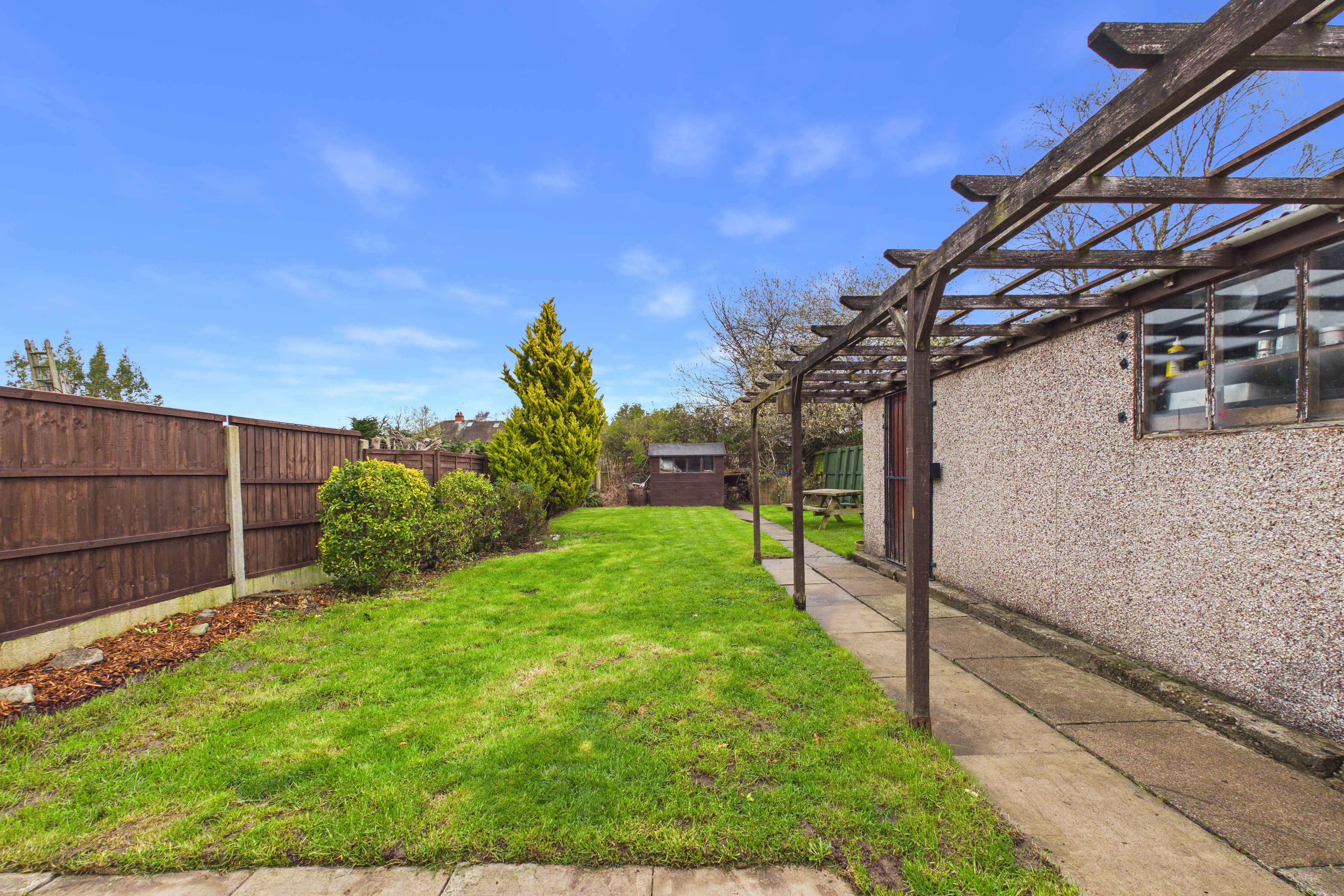 A gated side section continues alongside the home towards the detached garage and opens into the notably generous rear garden. This outdoor space is enclosed by fencing, predominantly laid to lawn, and features a paved patio that extends into a pathway leading to the foot of the garden, where a garden shed and mature shrubbery can be found.