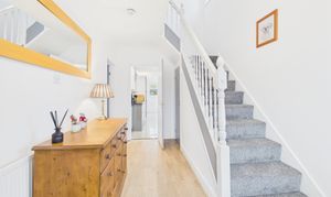 Entry is through an attractive arched porch with double-glazed doors, opening into a welcoming hallway laid with freshly installed wood-effect laminate flooring. The hall offers a spindle staircase to the first floor and a particularly useful understairs cupboard.